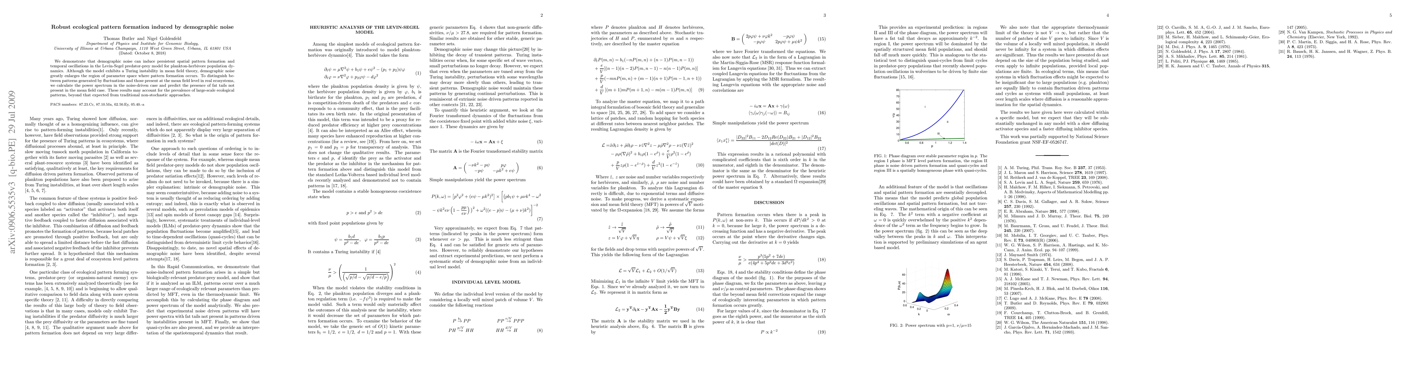 The research utilizes the Levin-Segel predator-prey model for plankton-herbivore population dynamics, incorporating demographic noise to analyze pattern formation and temporal oscillations through a combination of mean field theory and individual-level modeling.
