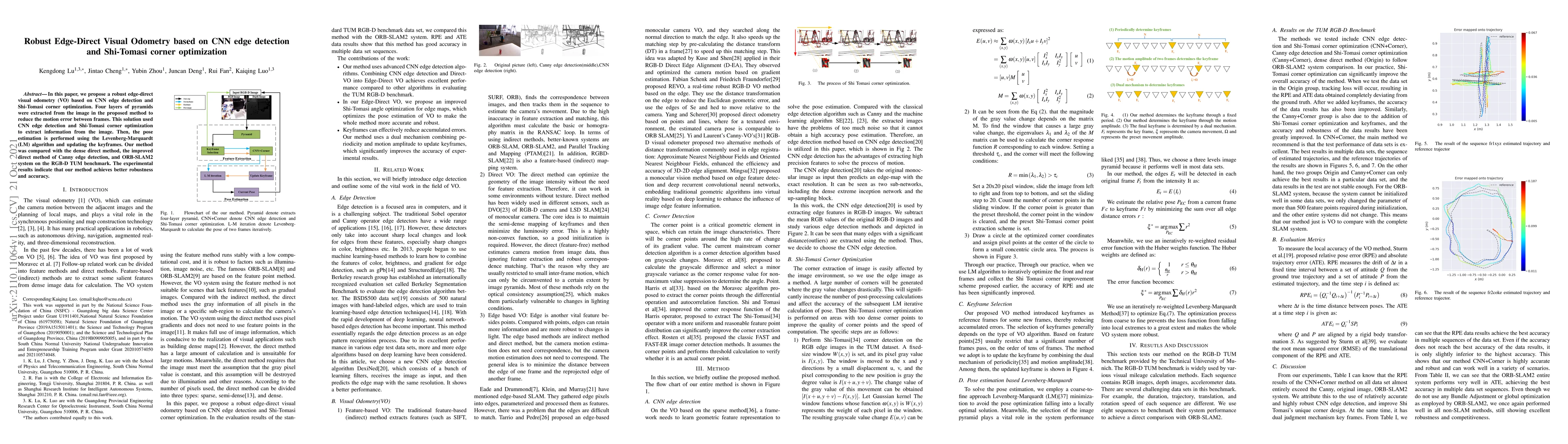 A new visual odometry method using CNN edge detection and Shi-Tomasi corner optimization achieves better robustness and accuracy than existing methods on the RGB-D TUM benchmark.