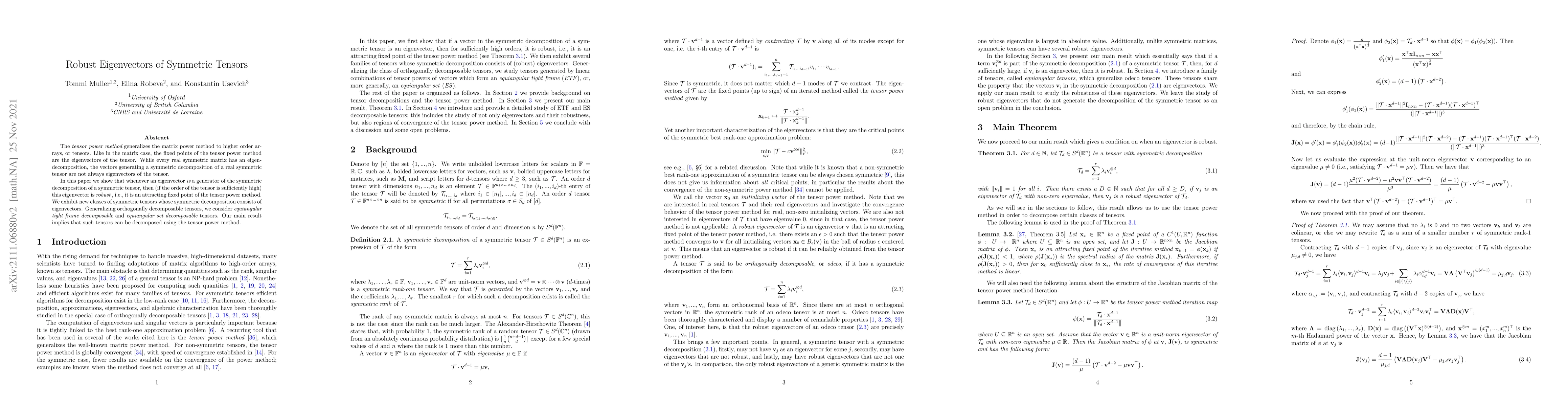 This paper demonstrates that eigenvectors generating the symmetric decomposition of sufficiently high-order symmetric tensors are robust, acting as attracting fixed points of the tensor power method. It introduces new classes of tensors, such as equiangular tight frame decomposable and equiangular set decomposable tensors, which can be decomposed using this method.