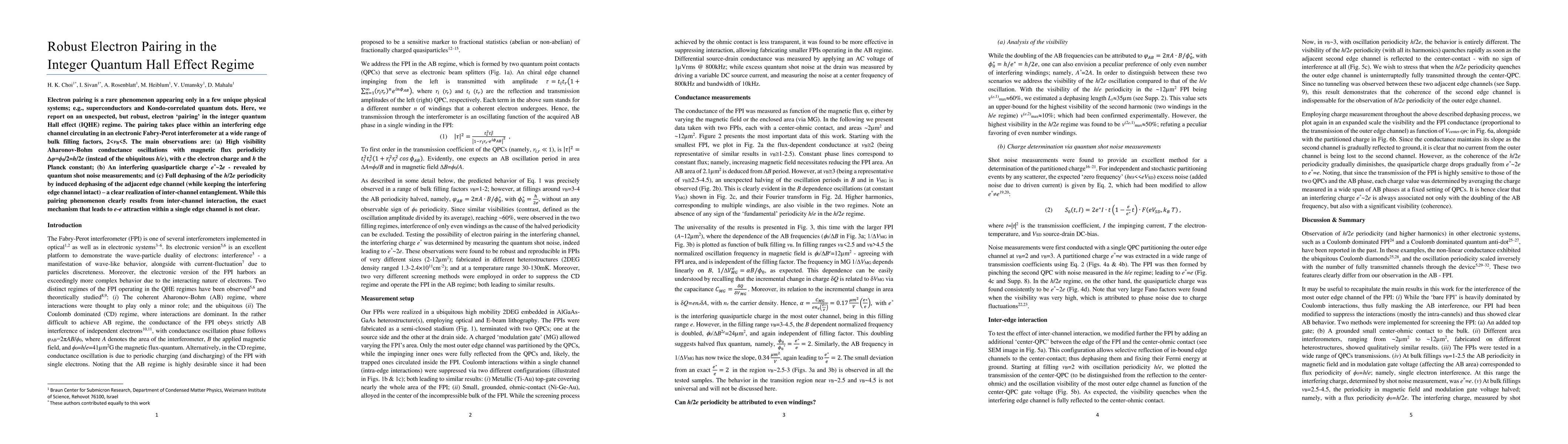 This paper reports robust electron pairing within an interfering edge channel in the integer quantum Hall effect regime, observed through high visibility Aharonov-Bohm oscillations, quasiparticle charge measurements, and inter-channel entanglement. The exact mechanism of electron attraction within a single edge channel remains unclear.