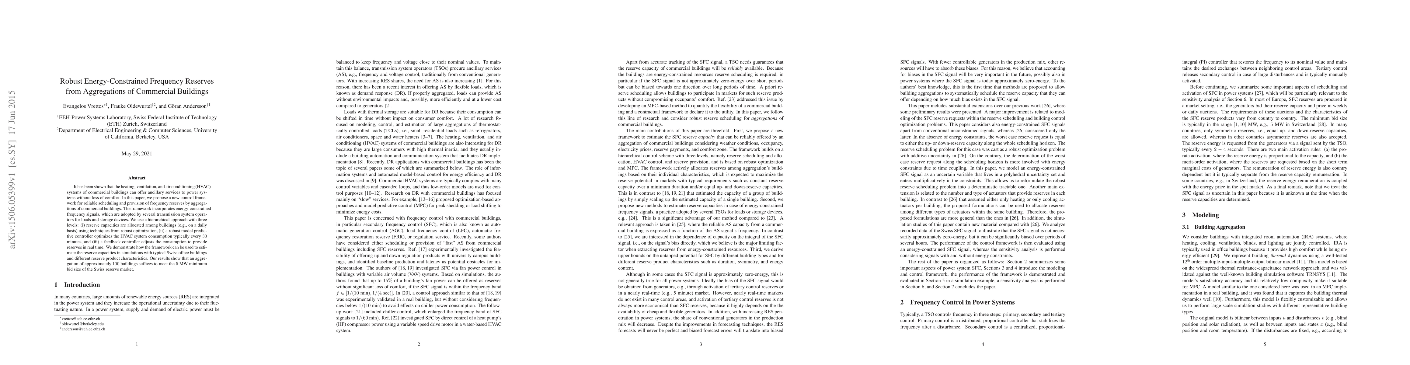This paper proposes a control framework for commercial buildings to provide energy-constrained frequency reserves to power systems, using robust optimization and model predictive control. Simulations show that aggregating around 100 buildings can meet the minimum bid size for Swiss reserve markets.