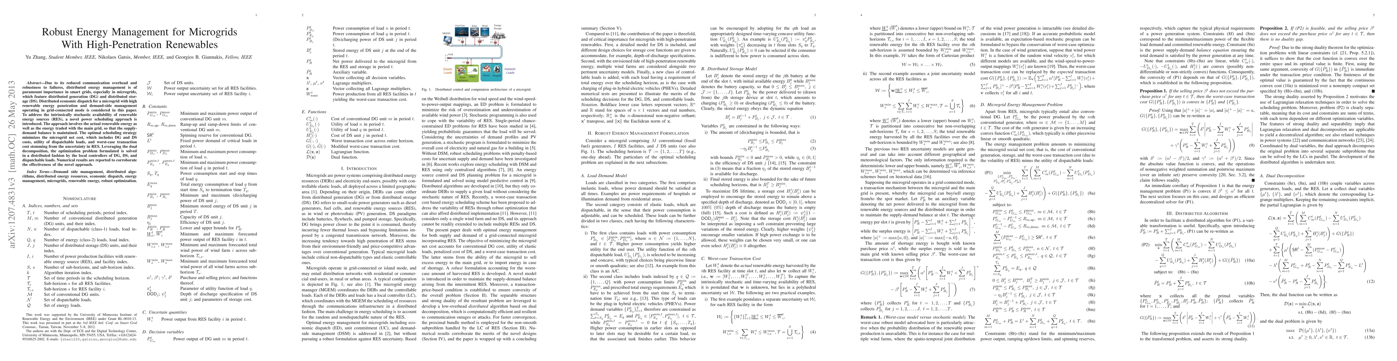 This paper proposes a robust distributed energy management strategy for microgrids with high renewable energy penetration, focusing on minimizing net costs through optimal scheduling. The approach leverages dual decomposition to solve the optimization problem in a distributed manner, ensuring supply-demand balance and addressing the stochastic nature of renewable energy sources.