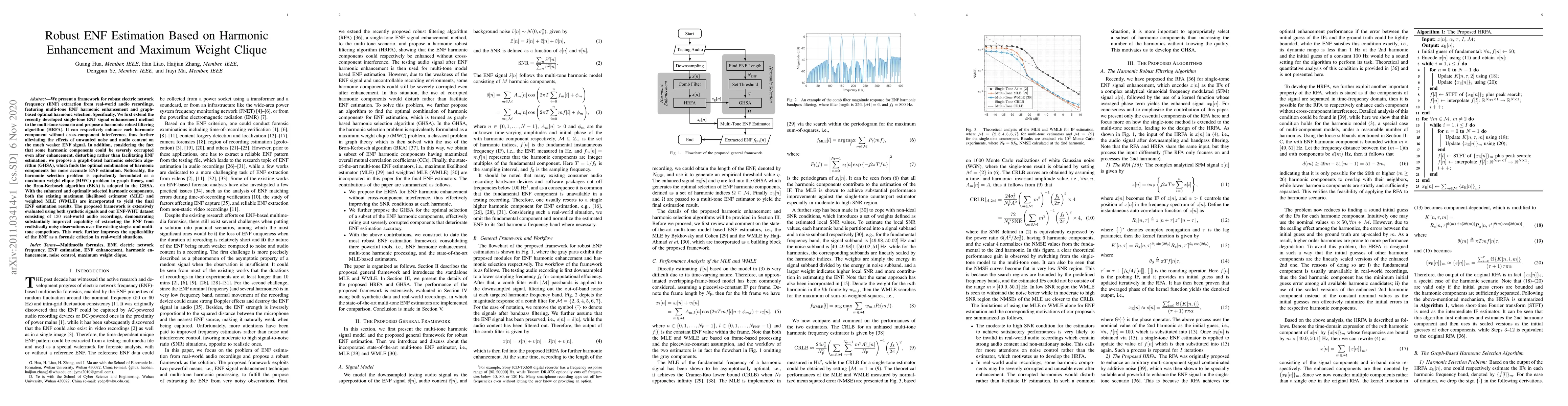 A new framework for extracting electric network frequency from audio recordings uses harmonic enhancement and graph-based selection to improve accuracy, outperforming existing methods in realistic noise scenarios.