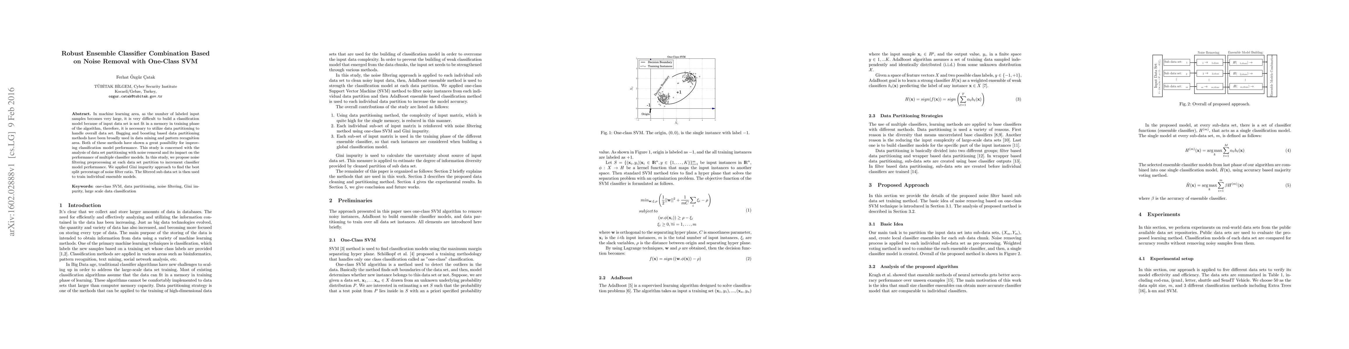 This study proposes a noise removal method using One-Class SVM to improve ensemble classifier performance when dealing with large datasets. By filtering out noise from each partition of the dataset, the model achieves better classification results.