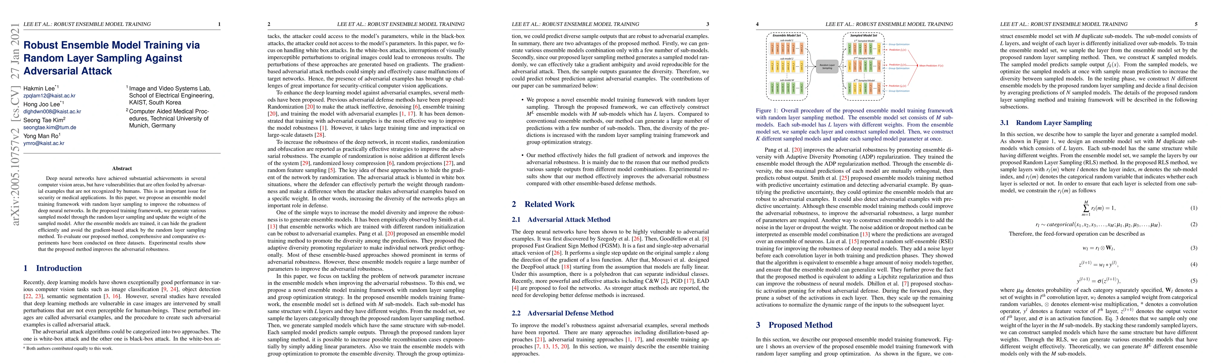 This paper proposes an ensemble model training framework using random layer sampling to enhance the robustness of deep neural networks against adversarial attacks. The method generates various sampled models and updates their weights, which helps hide gradients and thwart gradient-based attacks, as demonstrated by improved adversarial robustness in experiments on three datasets.