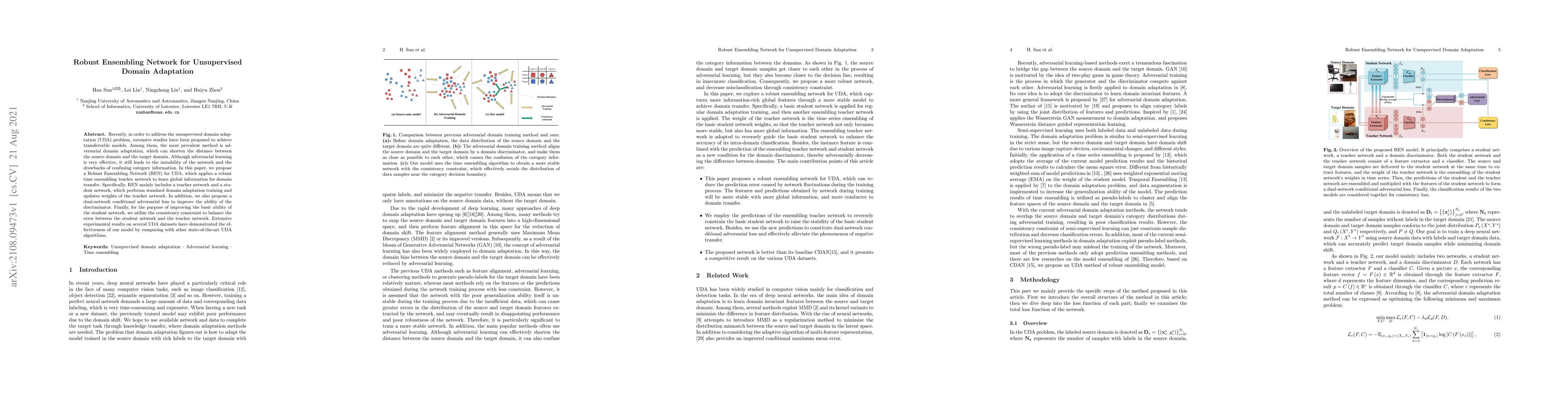 The paper proposes a Robust Ensembling Network for unsupervised domain adaptation, utilizing a teacher-student framework with a dual-network adversarial loss and consistency constraint to improve domain transferability, achieving better performance compared to other UDA methods.