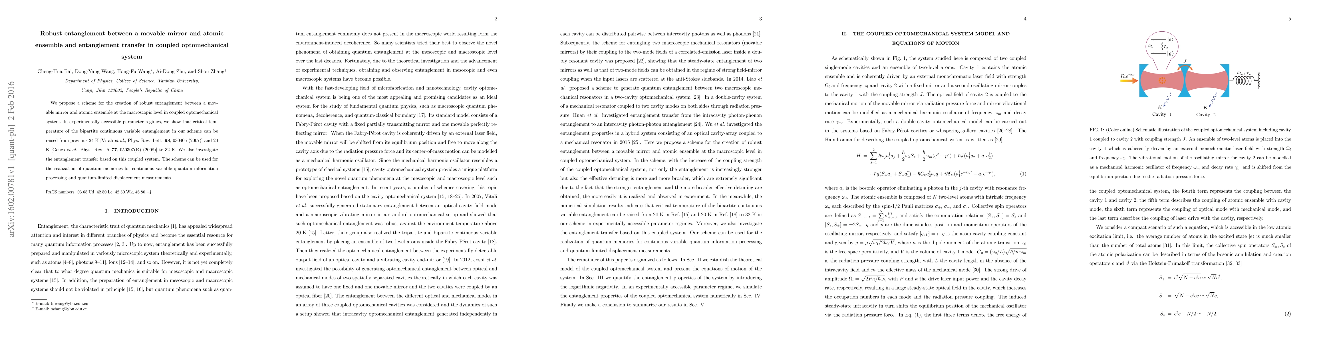 This paper proposes a method to create robust entanglement between a movable mirror and an atomic ensemble in a coupled optomechanical system, raising the critical temperature of bipartite continuous variable entanglement from 24 K to 32 K. The scheme also enables entanglement transfer, with potential applications for quantum memories and quantum-limited measurements.