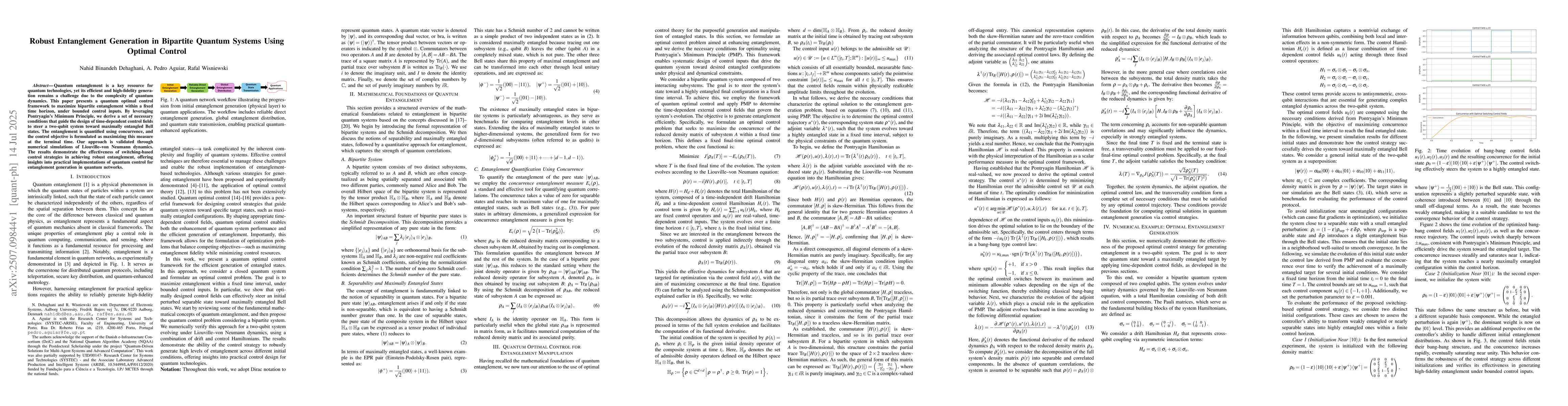 The paper presents a quantum optimal control framework using Pontryagin's Minimum Principle to maximize entanglement in bipartite quantum systems within a fixed time horizon, under bounded control inputs.