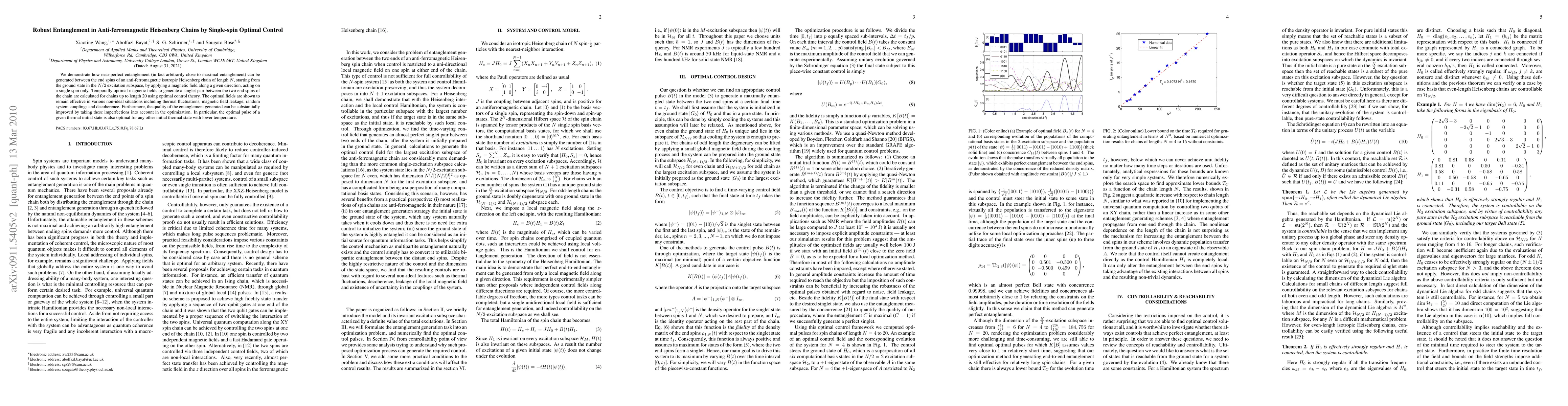 This study demonstrates the generation of near-perfect entanglement between the end spins of an anti-ferromagnetic Heisenberg chain using single-spin optimal control, showing robustness against various imperfections. Optimal magnetic fields are calculated for chains up to length 20, maintaining entanglement quality despite thermal fluctuations and other non-ideal conditions.