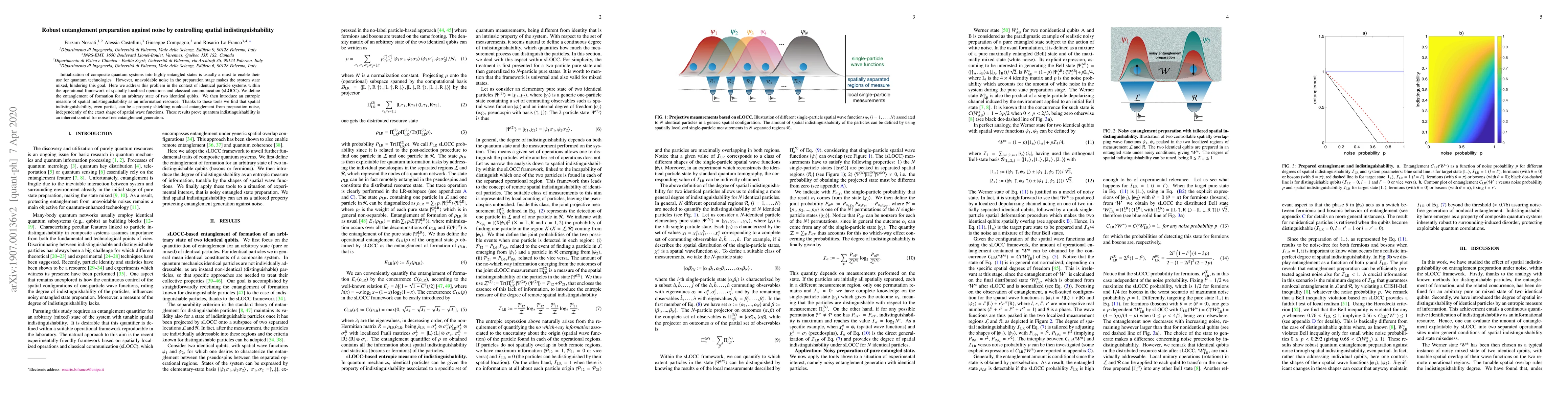 This paper proposes a method to robustly prepare entangled states in quantum systems by leveraging spatial indistinguishability under spatially localized operations and classical communication (sLOCC). It demonstrates that even partial spatial indistinguishability can shield entanglement from noise, ensuring Bell inequality violations, thus highlighting the importance of particle identity in noise-protected entanglement generation.