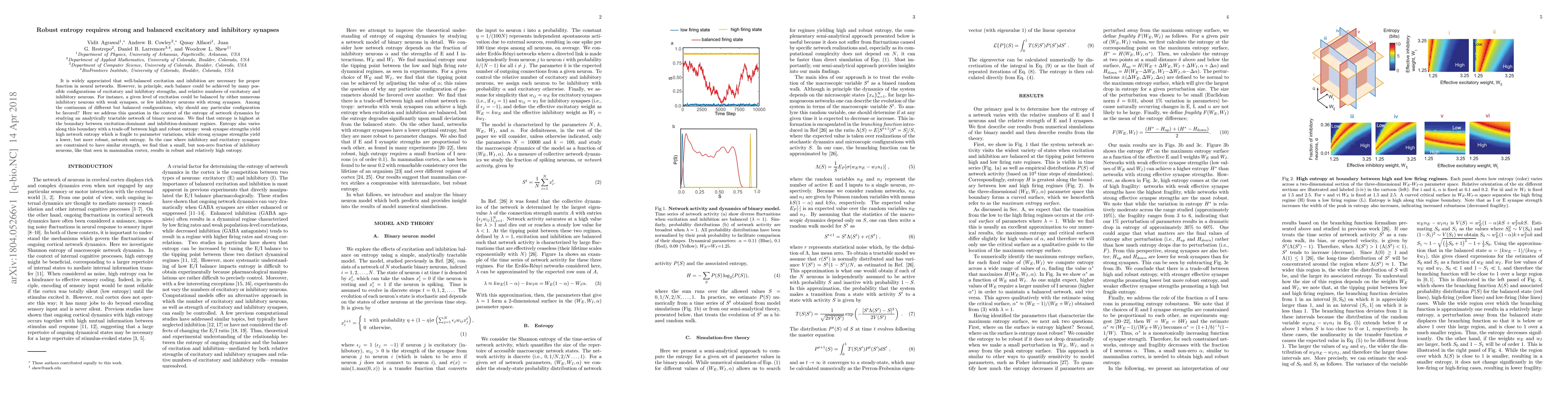This paper investigates the relationship between excitatory and inhibitory synapses in neural networks and their impact on entropy. It finds that the highest entropy, though fragile, occurs with weak synapses, while strong synapses yield lower but more robust entropy, suggesting that balanced, moderate synaptic strengths favor both robustness and high entropy.