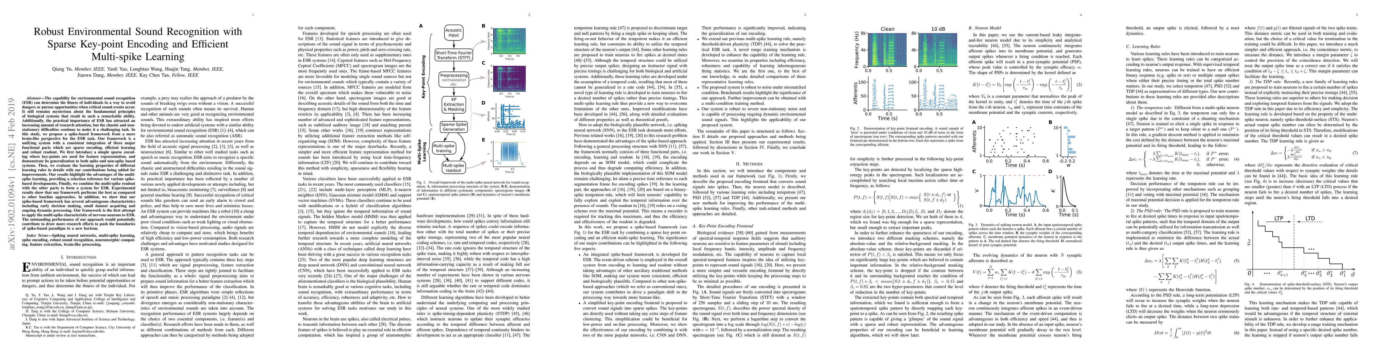 This paper proposes a spike-based framework for environmental sound recognition (ESR) that integrates sparse key-point encoding, efficient multi-spike learning, and robust readout. The framework demonstrates superior performance compared to baseline approaches, highlighting benefits such as early decision-making and minimal dataset requirements.