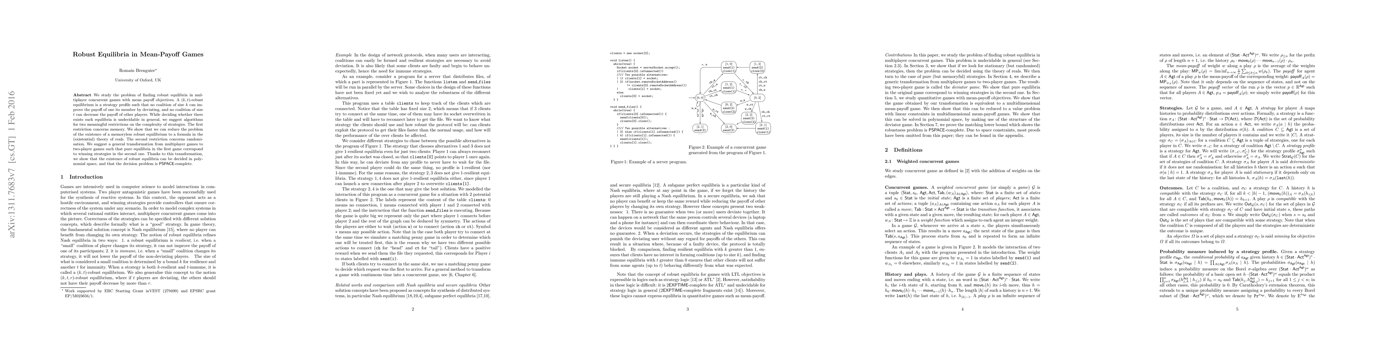 This paper explores the concept of robust equilibria in multiplayer concurrent games with mean payoff objectives, proposing a transformation to two-player games to find pure equilibria. It presents an algorithm for computing these equilibria and demonstrates that their existence is PSPACE-complete.
