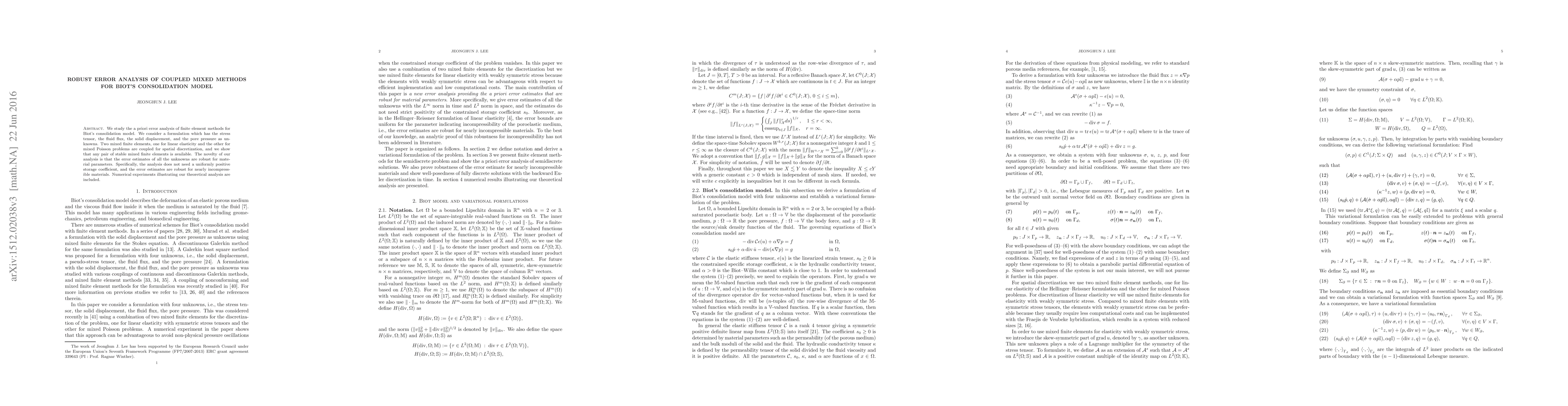 This paper presents an a priori error analysis for finite element methods applied to Biot's consolidation model, utilizing coupled mixed methods for spatial discretization. The analysis demonstrates robust error estimates for all unknowns, including stress tensor, fluid flux, solid displacement, and pore pressure, without requiring a uniformly positive storage coefficient, and is valid for nearly incompressible materials.