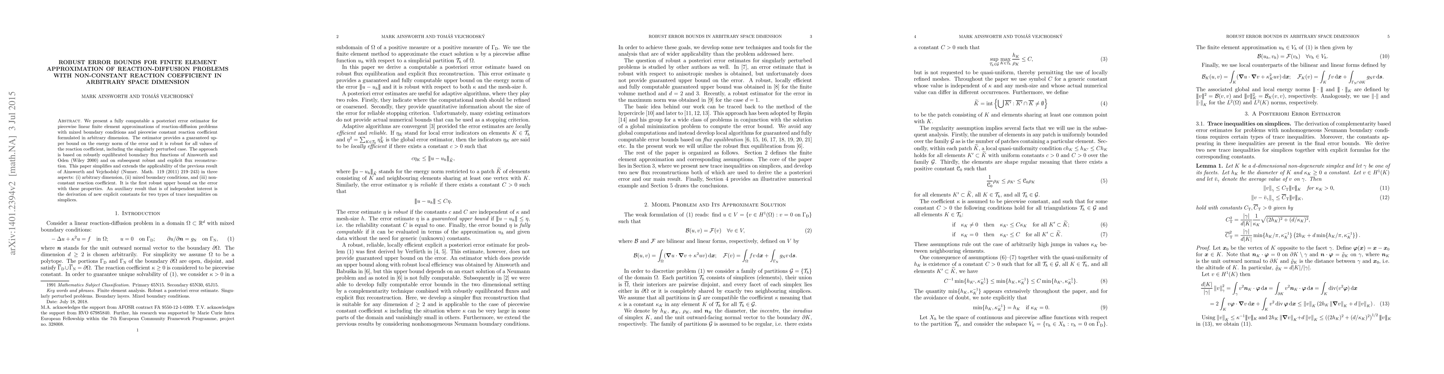 We present a fully computable a posteriori error estimator for piecewise linear finite element approximations of reaction-diffusion problems with mixed boundary conditions and piecewise constant reaction coefficient formulated in arbitrary dimension. The estimator provides a guaranteed upper bound on the energy norm of the error and it is robust for all values of the reaction coefficient, including the singularly perturbed case. The approach is based on robustly equilibrated boundary flux functions of Ainsworth and Oden (Wiley 2000) and on subsequent robust and explicit flux reconstruction. This paper simplifies and extends the applicability of the previous result of Ainsworth and Vejchodsk\'y (Numer. Math. 119 (2011) 219-243) in three aspects: (i) arbitrary dimension, (ii) mixed boundary conditions, and (iii) non-constant reaction coefficient. It is the first robust upper bound on the error with these properties. An auxiliary result that is of independent interest is the derivation of new explicit constants for two types of trace inequalities on simplices.