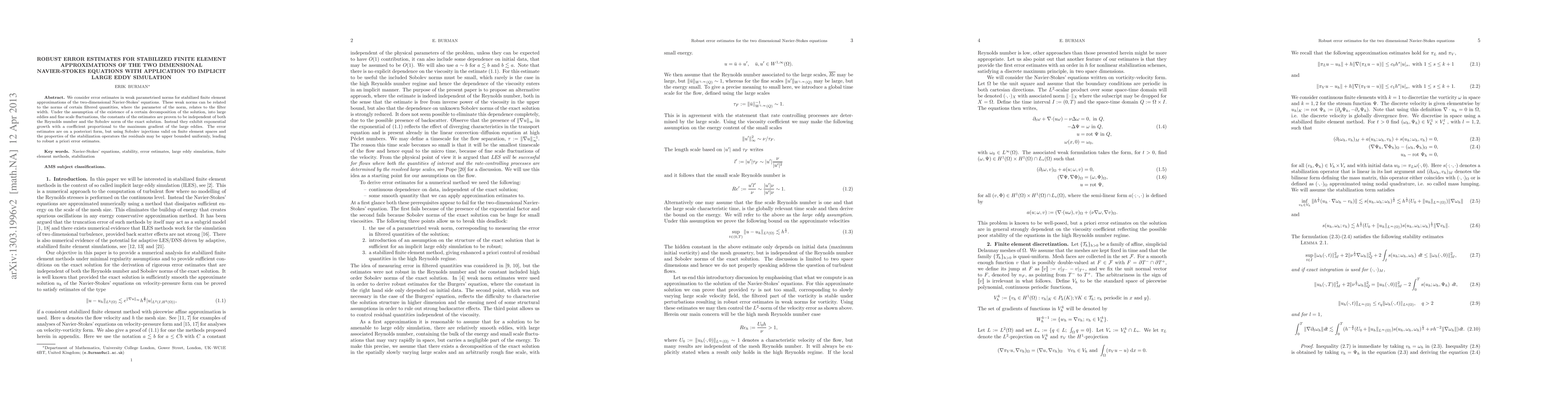We consider error estimates in weak parametrised norms for stabilized finite element approximations of the two-dimensional Navier-Stokes' equations. These weak norms can be related to the norms of certain filtered quantities, where the parameter of the norm, relates to the filter width. Under the assumption of the existence of a certain decomposition of the solution, into large eddies and fine scale fluctuations, the constants of the estimates are proven to be independent of both the Reynolds number and the Sobolev norm of the exact solution. Instead they exhibit exponential growth with a coefficient proportional to the maximum gradient of the large eddies. The error estimates are on a posteriori form, but using Sobolev injections valid on finite element spaces and the properties of the stabilization operators the residuals may be upper bounded uniformly, leading to robust a priori error estimates.