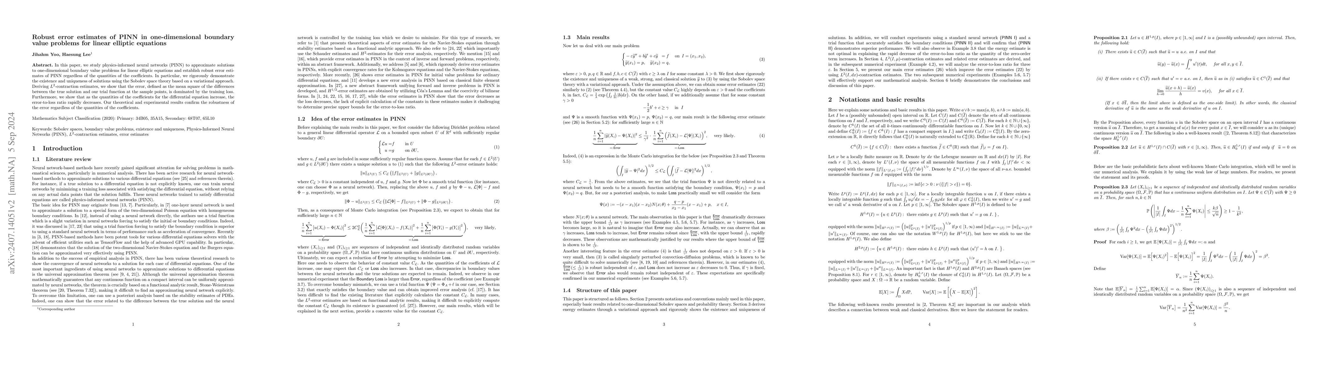 This paper investigates physics-informed neural networks (PINN) for solving one-dimensional boundary value problems for linear elliptic equations, providing robust error estimates independent of coefficient quantities. It uses Sobolev space theory and variational approaches to demonstrate solution existence and uniqueness, and establishes $L^2$-contraction error estimates dominated by training loss.