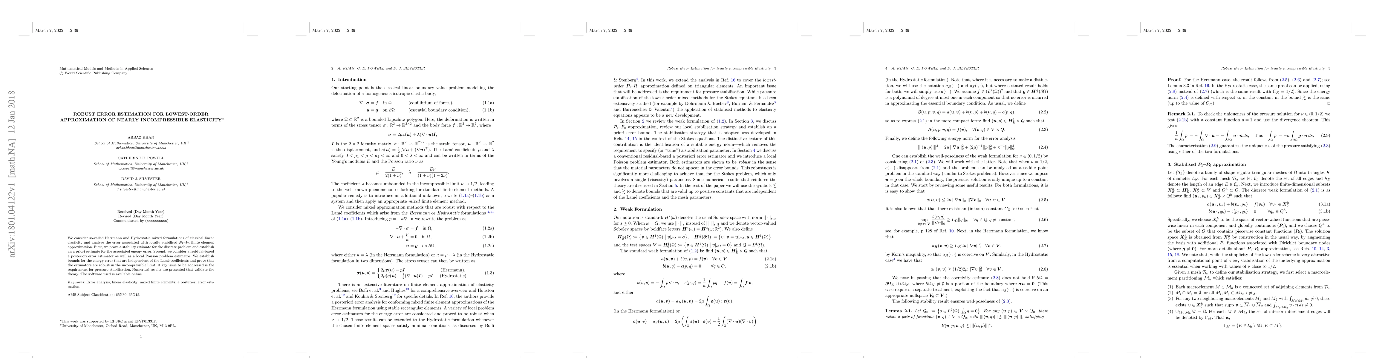 This paper analyzes the error in locally stabilised $P_1-P_0$ finite element approximations for nearly incompressible elasticity using Herrmann and Hydrostatic mixed formulations. The authors prove stability and establish robust a priori and a posteriori error estimators independent of the Lamé coefficients, validated by numerical results.