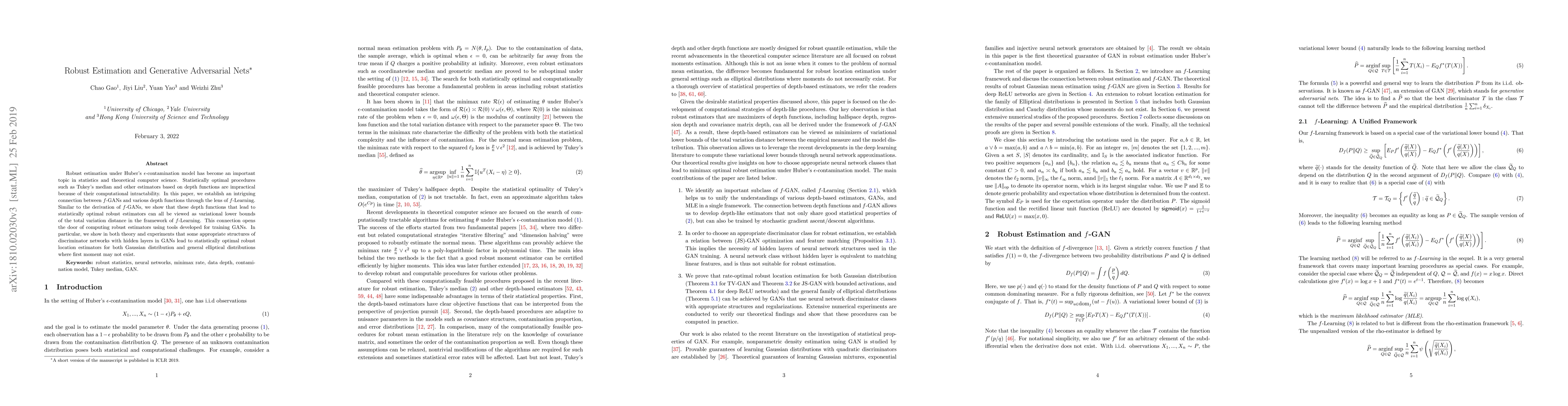 This paper connects Generative Adversarial Nets (GANs) to robust estimation in statistics, showing that GANs can be used to compute statistically optimal robust estimators for distributions with missing first moments.