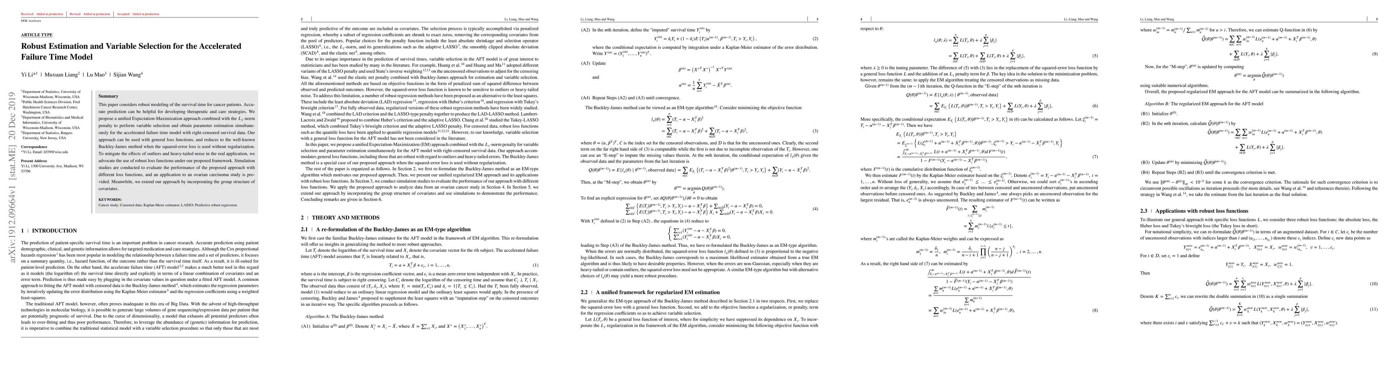 This paper proposes a robust Expectation-Maximization method with L1-norm penalty for simultaneous variable selection and parameter estimation in the accelerated failure time model, especially for right-censored survival data in cancer patients. The method uses robust loss functions to mitigate outliers and is evaluated through simulation and an ovarian carcinoma study.