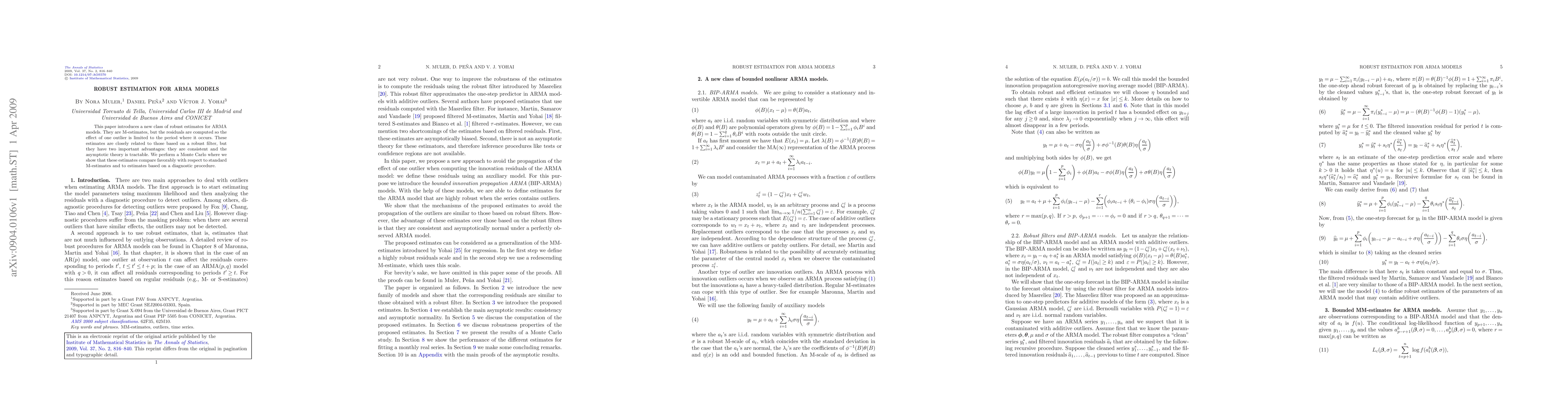 This paper introduces a new class of robust estimates for ARMA models. They are M-estimates, but the residuals are computed so the effect of one outlier is limited to the period where it occurs. These estimates are closely related to those based on a robust filter, but they have two important advantages: they are consistent and the asymptotic theory is tractable. We perform a Monte Carlo where we show that these estimates compare favorably with respect to standard M-estimates and to estimates based on a diagnostic procedure.