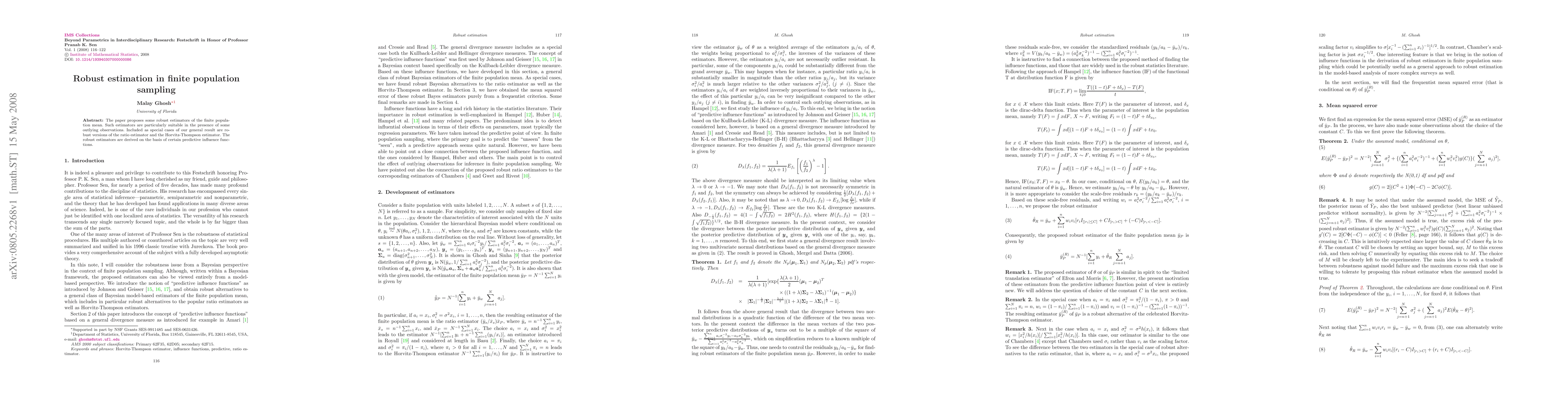 This paper proposes robust estimators for finite population sampling to handle outlying observations, building on predictive influence functions. It also includes special cases of the ratio estimator and Horvitz-Thompson estimator.