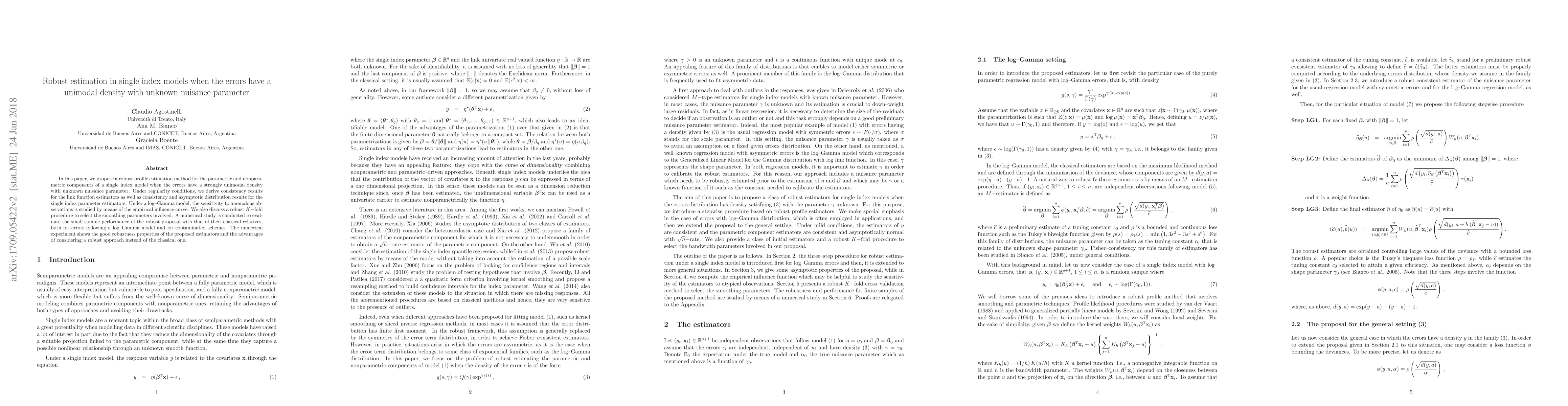 This paper proposes a robust estimation method for single index models with errors having a strongly unimodal density and unknown nuisance parameters. It demonstrates the method's robustness through empirical influence curves and a $K-$fold procedure, and shows superior small sample performance over classical methods in numerical studies.