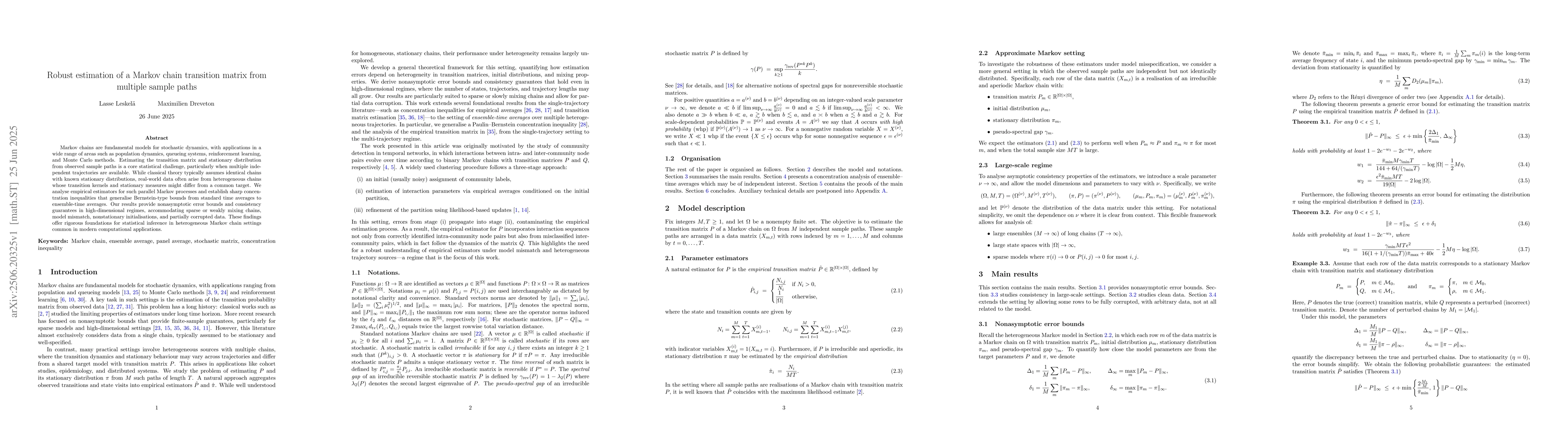 Markov chains are fundamental models for stochastic dynamics, with applications in a wide range of areas such as population dynamics, queueing systems, reinforcement learning, and Monte Carlo methods. Estimating the transition matrix and stationary distribution from observed sample paths is a core statistical challenge, particularly when multiple independent trajectories are available. While classical theory typically assumes identical chains with known stationary distributions, real-world data often arise from heterogeneous chains whose transition kernels and stationary measures might differ from a common target. We analyse empirical estimators for such parallel Markov processes and establish sharp concentration inequalities that generalise Bernstein-type bounds from standard time averages to ensemble-time averages. Our results provide nonasymptotic error bounds and consistency guarantees in high-dimensional regimes, accommodating sparse or weakly mixing chains, model mismatch, nonstationary initialisations, and partially corrupted data. These findings offer rigorous foundations for statistical inference in heterogeneous Markov chain settings common in modern computational applications.