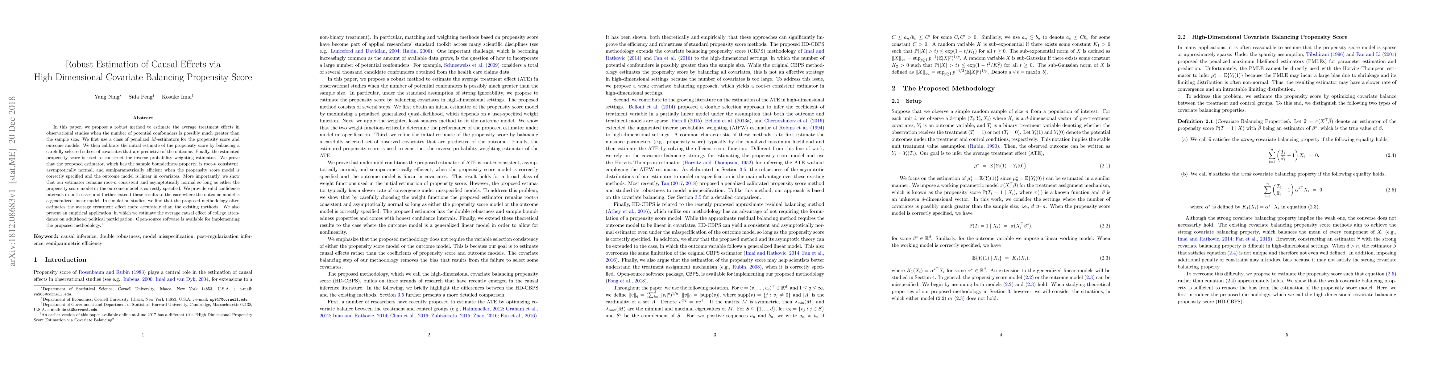 This paper introduces a robust method for estimating average treatment effects in high-dimensional observational studies using penalized M-estimators and covariate balancing propensity scores. The method remains consistent and normal even if only one model is correctly specified, and it often outperforms existing methods in simulations and real-world applications.