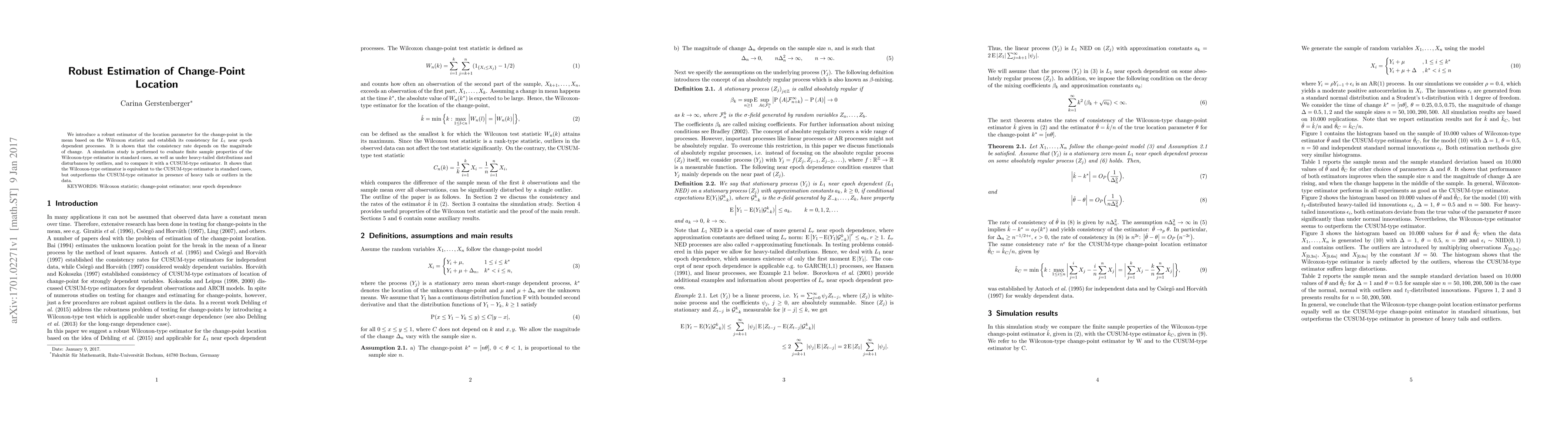 We introduce a robust estimator of the location parameter for the change-point in the mean based on the Wilcoxon statistic and establish its consistency for $L_1$ near epoch dependent processes. It is shown that the consistency rate depends on the magnitude of change. A simulation study is performed to evaluate finite sample properties of the Wilcoxon-type estimator in standard cases, as well as under heavy-tailed distributions and disturbances by outliers, and to compare it with a CUSUM-type estimator. It shows that the Wilcoxon-type estimator is equivalent to the CUSUM-type estimator in standard cases, but outperforms the CUSUM-type estimator in presence of heavy tails or outliers in the data.