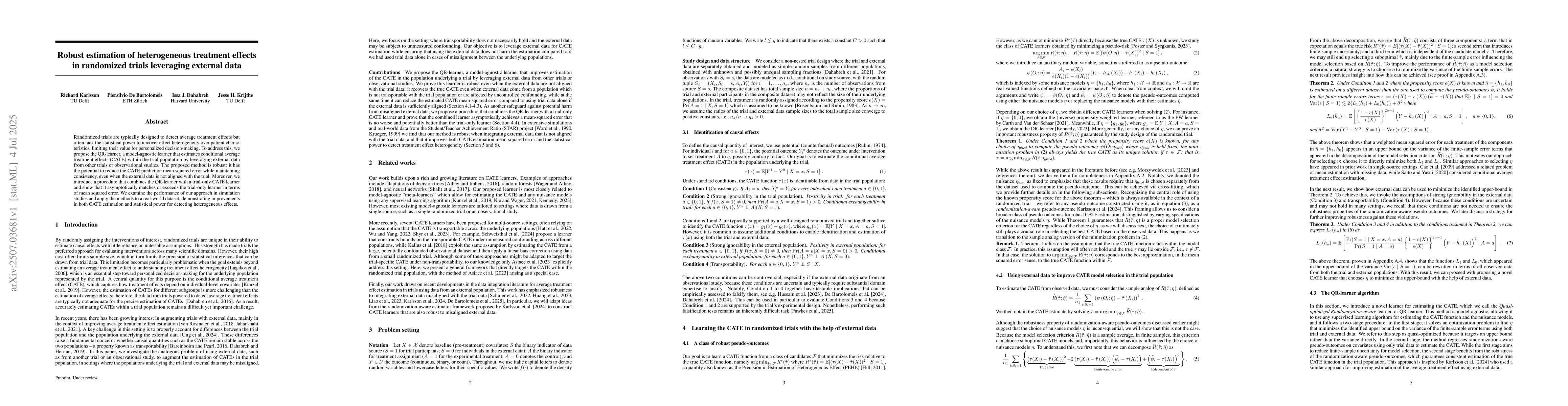 Randomized trials are typically designed to detect average treatment effects but often lack the statistical power to uncover effect heterogeneity over patient characteristics, limiting their value for personalized decision-making. To address this, we propose the QR-learner, a model-agnostic learner that estimates conditional average treatment effects (CATE) within the trial population by leveraging external data from other trials or observational studies. The proposed method is robust: it has the potential to reduce the CATE prediction mean squared error while maintaining consistency, even when the external data is not aligned with the trial. Moreover, we introduce a procedure that combines the QR-learner with a trial-only CATE learner and show that it asymptotically matches or exceeds the trial-only learner in terms of mean squared error. We examine the performance of our approach in simulation studies and apply the methods to a real-world dataset, demonstrating improvements in both CATE estimation and statistical power for detecting heterogeneous effects.