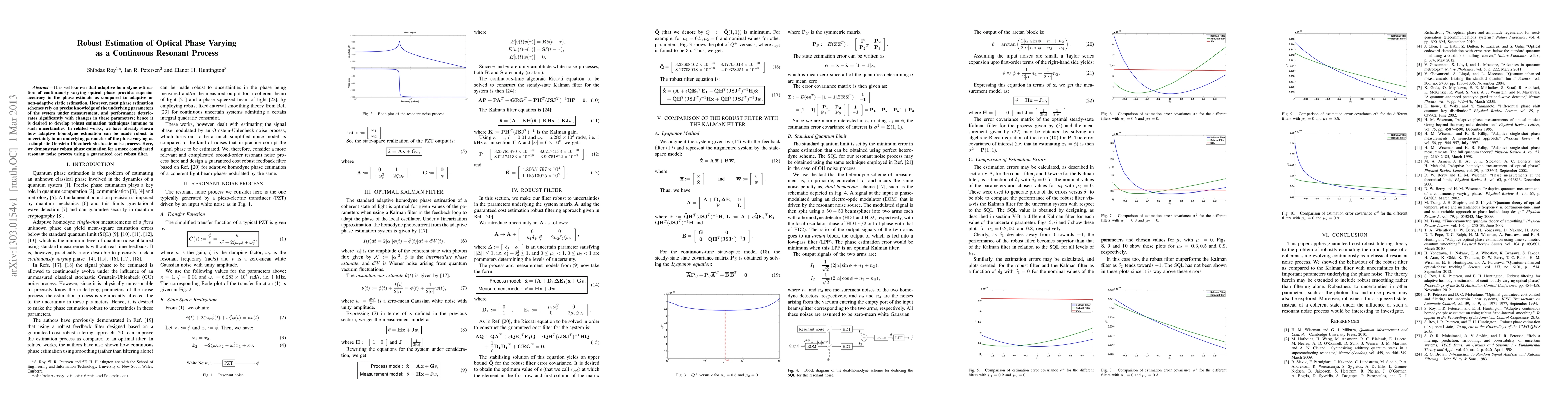 This paper develops robust adaptive homodyne estimation techniques for continuously varying optical phase, focusing on improving accuracy despite uncertainties in system parameters. It extends previous work on simplistic noise processes by employing a guaranteed cost robust filter to handle more complex resonant noise, ensuring reliable phase estimation.