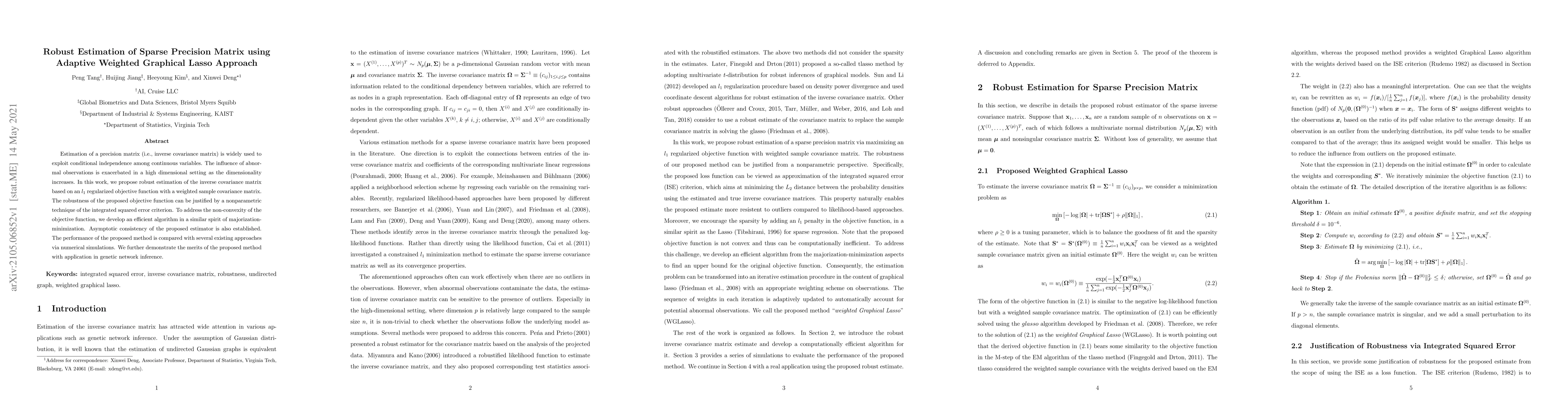 This paper proposes a robust estimation method for sparse precision matrices using an adaptive weighted graphical Lasso approach to handle high-dimensional data and mitigate the influence of outliers. The method employs an $l_1$ regularized objective function with a weighted sample covariance matrix, and an efficient algorithm is developed to address its non-convexity.