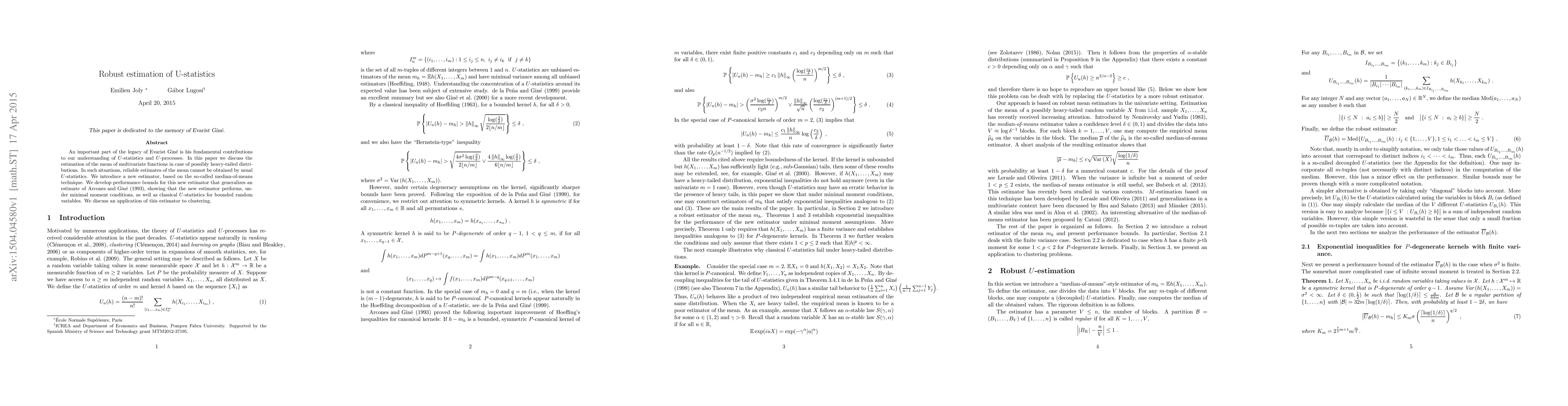 An important part of the legacy of Evarist Gin\'e is his fundamental contributions to our understanding of $U$-statistics and $U$-processes. In this paper we discuss the estimation of the mean of multivariate functions in case of possibly heavy-tailed distributions. In such situations, reliable estimates of the mean cannot be obtained by usual $U$-statistics. We introduce a new estimator, based on the so-called median-of-means technique. We develop performance bounds for this new estimator that generalizes an estimate of Arcones and Gin\'e (1993), showing that the new estimator performs, under minimal moment conditions, as well as classical $U$-statistics for bounded random variables. We discuss an application of this estimator to clustering.