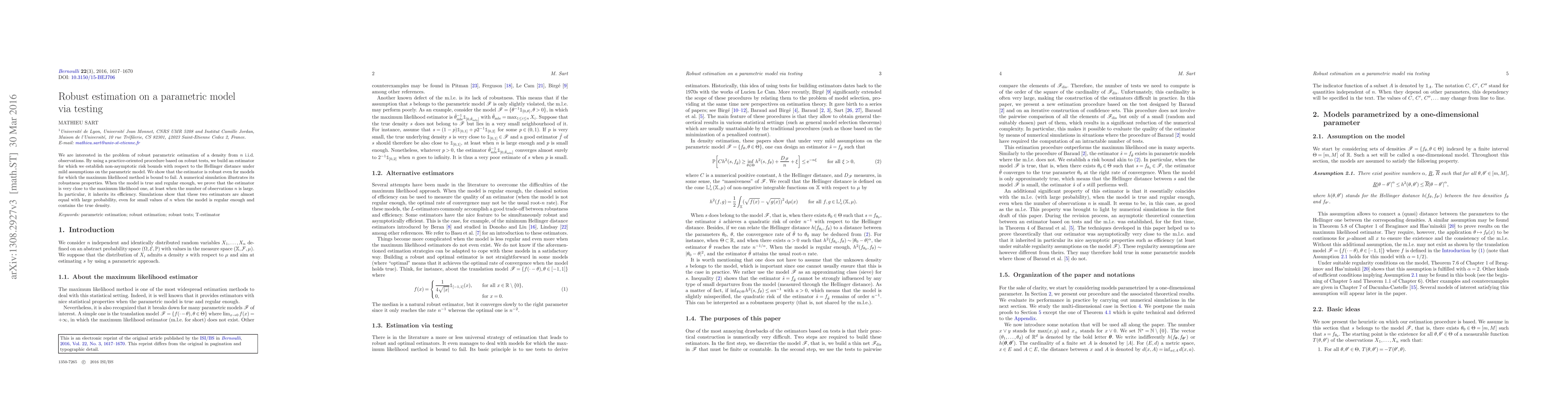 We are interested in the problem of robust parametric estimation of a density from $n$ i.i.d. observations. By using a practice-oriented procedure based on robust tests, we build an estimator for which we establish non-asymptotic risk bounds with respect to the Hellinger distance under mild assumptions on the parametric model. We show that the estimator is robust even for models for which the maximum likelihood method is bound to fail. A numerical simulation illustrates its robustness properties. When the model is true and regular enough, we prove that the estimator is very close to the maximum likelihood one, at least when the number of observations $n$ is large. In particular, it inherits its efficiency. Simulations show that these two estimators are almost equal with large probability, even for small values of $n$ when the model is regular enough and contains the true density.