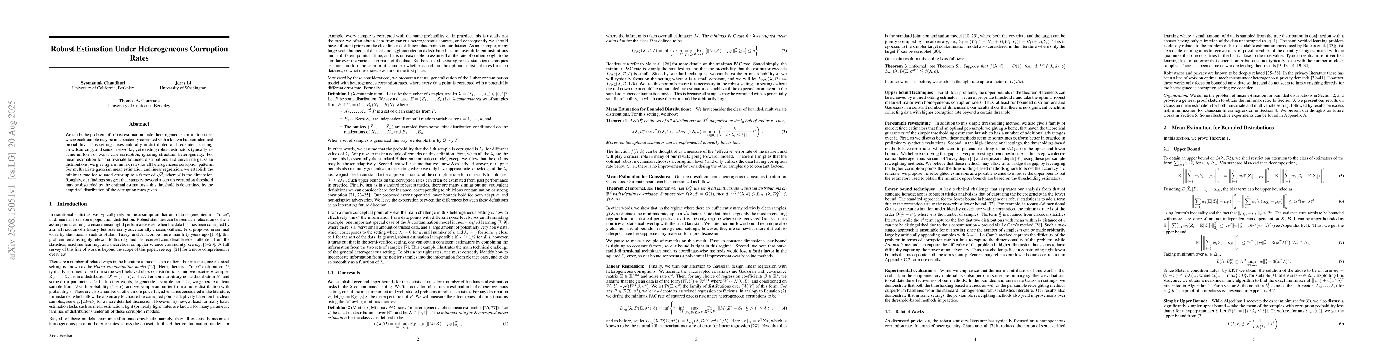 We study the problem of robust estimation under heterogeneous corruption rates, where each sample may be independently corrupted with a known but non-identical probability. This setting arises naturally in distributed and federated learning, crowdsourcing, and sensor networks, yet existing robust estimators typically assume uniform or worst-case corruption, ignoring structural heterogeneity. For mean estimation for multivariate bounded distributions and univariate gaussian distributions, we give tight minimax rates for all heterogeneous corruption patterns. For multivariate gaussian mean estimation and linear regression, we establish the minimax rate for squared error up to a factor of $\sqrt{d}$, where $d$ is the dimension. Roughly, our findings suggest that samples beyond a certain corruption threshold may be discarded by the optimal estimators -- this threshold is determined by the empirical distribution of the corruption rates given.