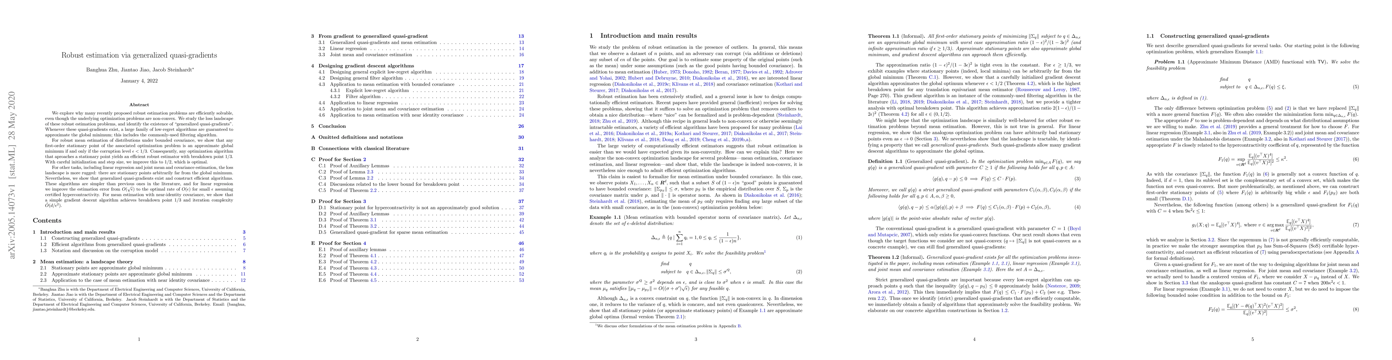The paper explores robust estimation problems and identifies 'generalized quasi-gradients' for efficient algorithms, analyzing loss landscapes for various tasks including mean estimation, linear regression, and joint mean and covariance estimation.