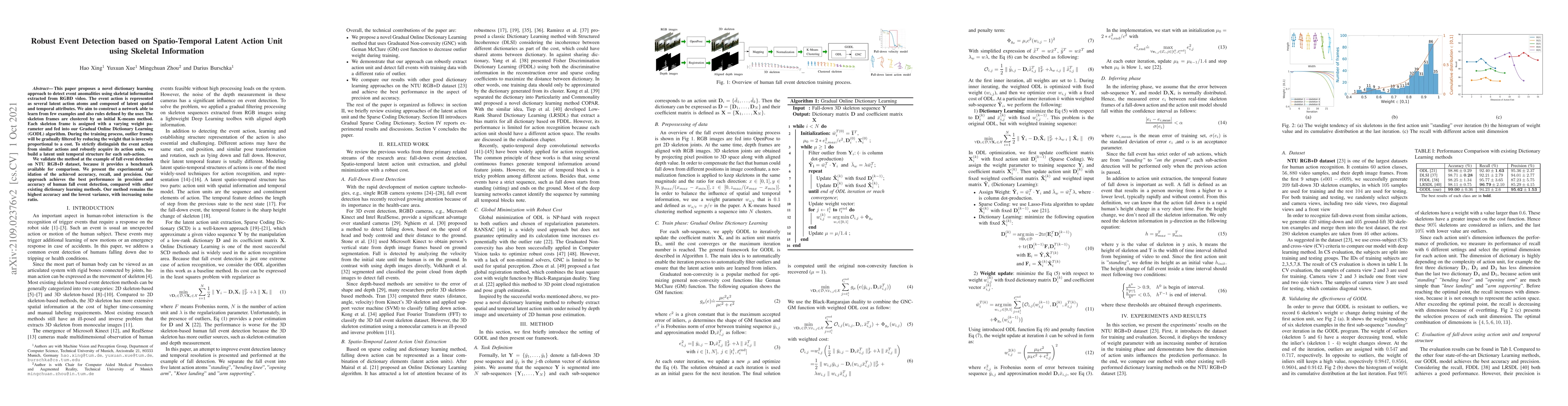 This paper propose a novel dictionary learning approach to detect event action using skeletal information extracted from RGBD video. The event action is represented as several latent atoms and composed of latent spatial and temporal attributes. We perform the method at the example of fall event detection. The skeleton frames are clustered by an initial K-means method. Each skeleton frame is assigned with a varying weight parameter and fed into our Gradual Online Dictionary Learning (GODL) algorithm. During the training process, outlier frames will be gradually filtered by reducing the weight that is inversely proportional to a cost. In order to strictly distinguish the event action from similar actions and robustly acquire its action unit, we build a latent unit temporal structure for each sub-action. We evaluate the proposed method on parts of the NTURGB+D dataset, which includes 209 fall videos, 405 ground-lift videos, 420 sit-down videos, and 280 videos of 46 otheractions. We present the experimental validation of the achieved accuracy, recall and precision. Our approach achieves the bestperformance on precision and accuracy of human fall event detection, compared with other existing dictionary learning methods. With increasing noise ratio, our method remains the highest accuracy and the lowest variance.