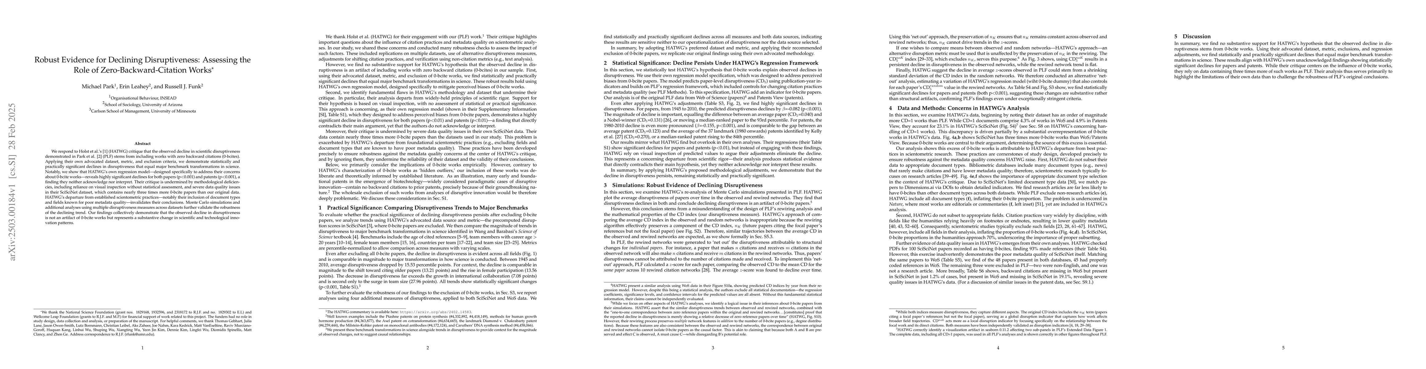 We respond to Holst et al.'s (HATWG) critique that the observed decline in scientific disruptiveness demonstrated in Park et al. (PLF) stems from including works with zero backward citations (0-bcites). Applying their own advocated dataset, metric, and exclusion criteria, we demonstrate statistically and practically significant declines in disruptiveness that equal major benchmark transformations in science. Notably, we show that HATWG's own regression model -- designed specifically to address their concerns about 0-bcite works -- reveals highly significant declines for both papers (p<0.001) and patents (p<0.001), a finding they neither acknowledge nor interpret. Their critique is undermined by methodological deficiencies, including reliance on visual inspection without statistical assessment, and severe data quality issues in their SciSciNet dataset, which contains nearly three times more 0-bcite papers than our original data. HATWG's departure from established scientometric practices -- notably their inclusion of document types and fields known for poor metadata quality -- invalidates their conclusions. Monte Carlo simulations and additional analyses using multiple disruptiveness measures across datasets further validate the robustness of the declining trend. Our findings collectively demonstrate that the observed decline in disruptiveness is not an artifact of 0-bcite works but represents a substantive change in scientific and technological innovation patterns.