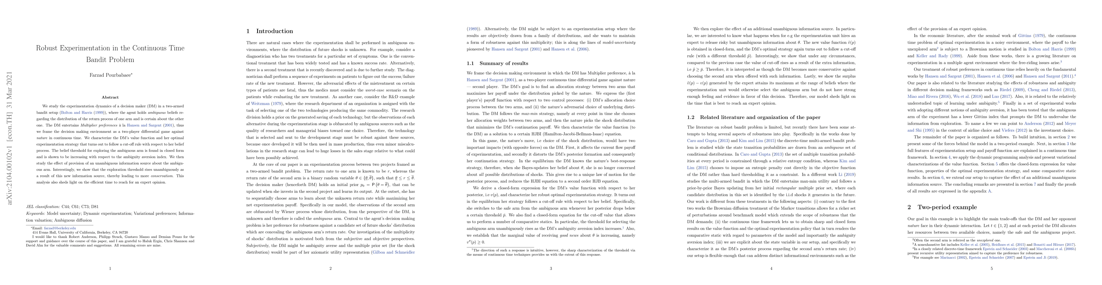 We study the experimentation dynamics of a decision maker (DM) in a two-armed bandit setup (Bolton and Harris (1999)), where the agent holds ambiguous beliefs regarding the distribution of the return process of one arm and is certain about the other one. The DM entertains Multiplier preferences a la Hansen and Sargent (2001), thus we frame the decision making environment as a two-player differential game against nature in continuous time. We characterize the DM value function and her optimal experimentation strategy that turns out to follow a cut-off rule with respect to her belief process. The belief threshold for exploring the ambiguous arm is found in closed form and is shown to be increasing with respect to the ambiguity aversion index. We then study the effect of provision of an unambiguous information source about the ambiguous arm. Interestingly, we show that the exploration threshold rises unambiguously as a result of this new information source, thereby leading to more conservatism. This analysis also sheds light on the efficient time to reach for an expert opinion.