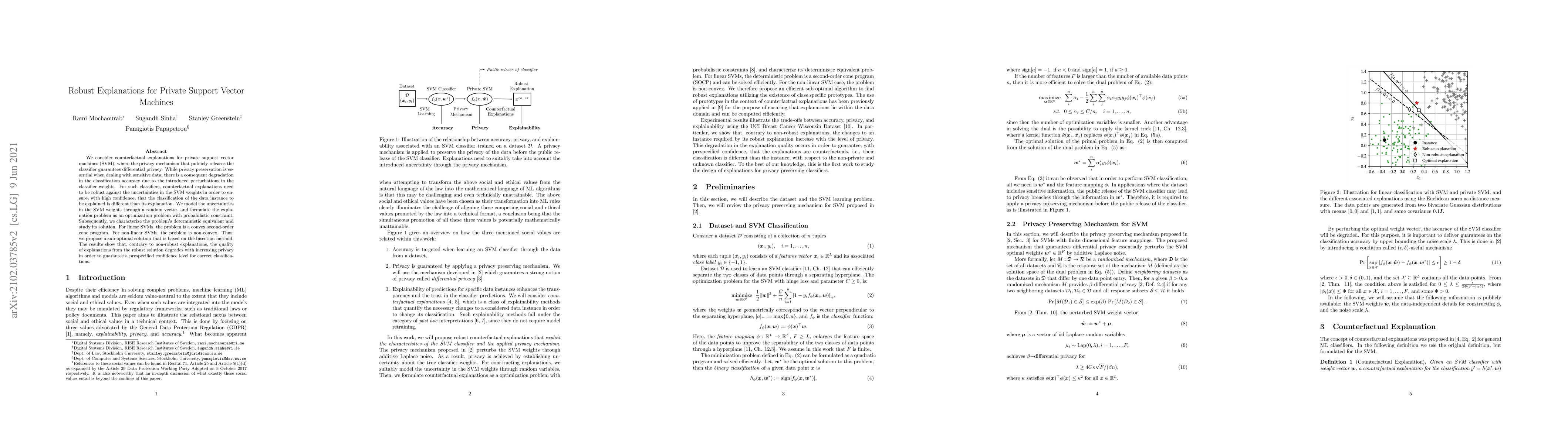 The paper presents a robust framework for generating counterfactual explanations for private SVMs, incorporating probabilistic constraints to account for uncertainties in perturbed classifier weights, and proposes efficient solution methods including a sub-optimal approach via the bisection method for non-linear SVMs.