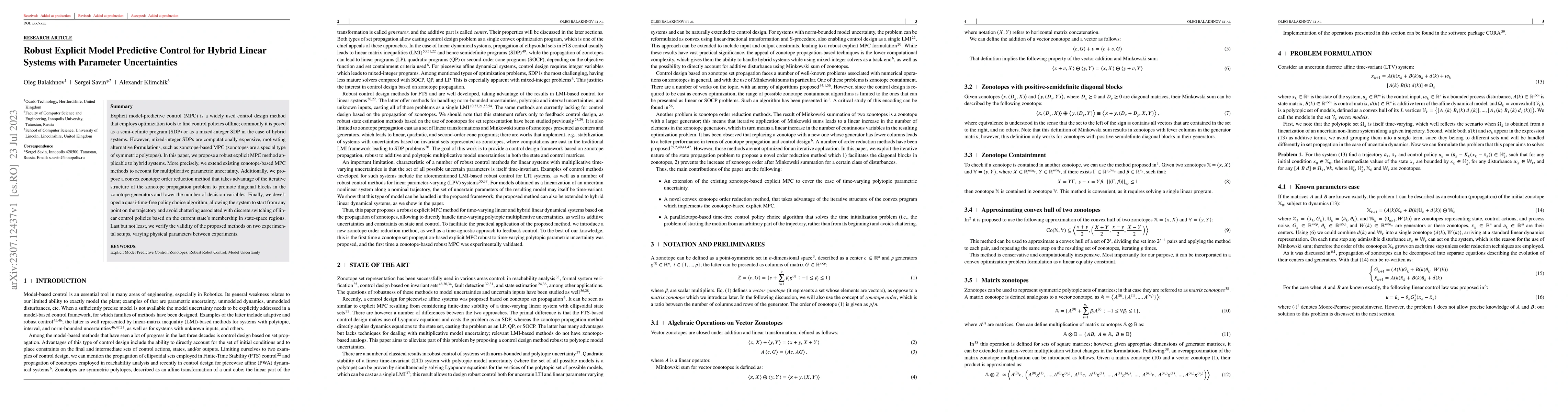 This paper proposes a robust explicit model-predictive control (MPC) method for hybrid linear systems with parameter uncertainties, extending zonotope-based MPC and introducing a convex zonotope reduction technique to reduce computational complexity. The method also includes a quasi-time-free policy choice algorithm to mitigate chattering and is validated experimentally.