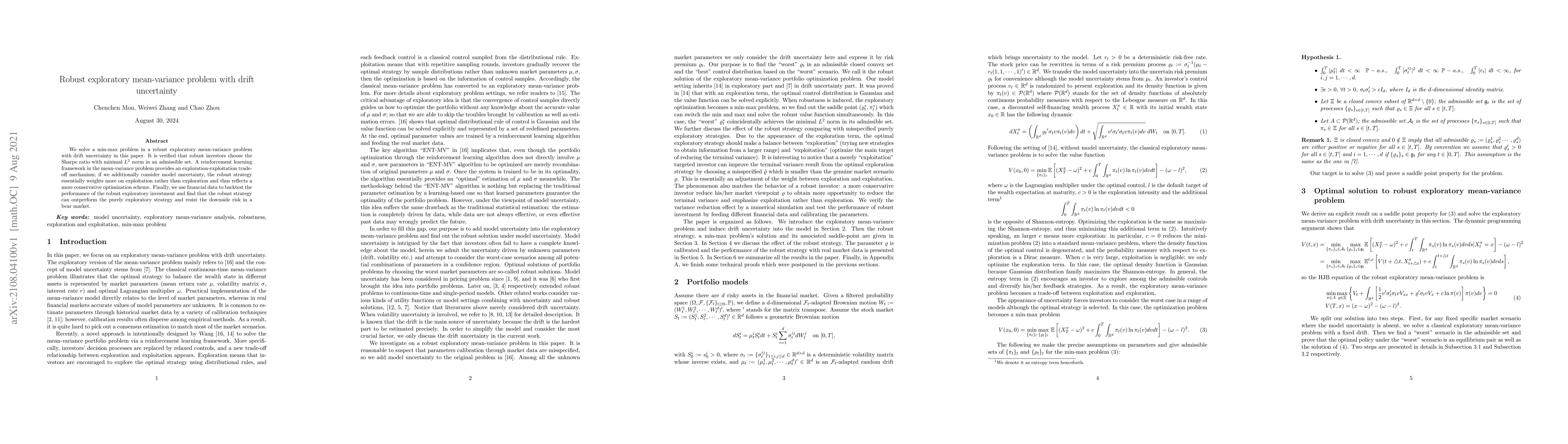 We solve a min-max problem in a robust exploratory mean-variance problem with drift uncertainty in this paper. It is verified that robust investors choose the Sharpe ratio with minimal $L^2$ norm in an admissible set. A reinforcement learning framework in the mean-variance problem provides an exploration-exploitation trade-off mechanism; if we additionally consider model uncertainty, the robust strategy essentially weights more on exploitation rather than exploration and thus reflects a more conservative optimization scheme. Finally, we use financial data to backtest the performance of the robust exploratory investment and find that the robust strategy can outperform the purely exploratory strategy and resist the downside risk in a bear market.