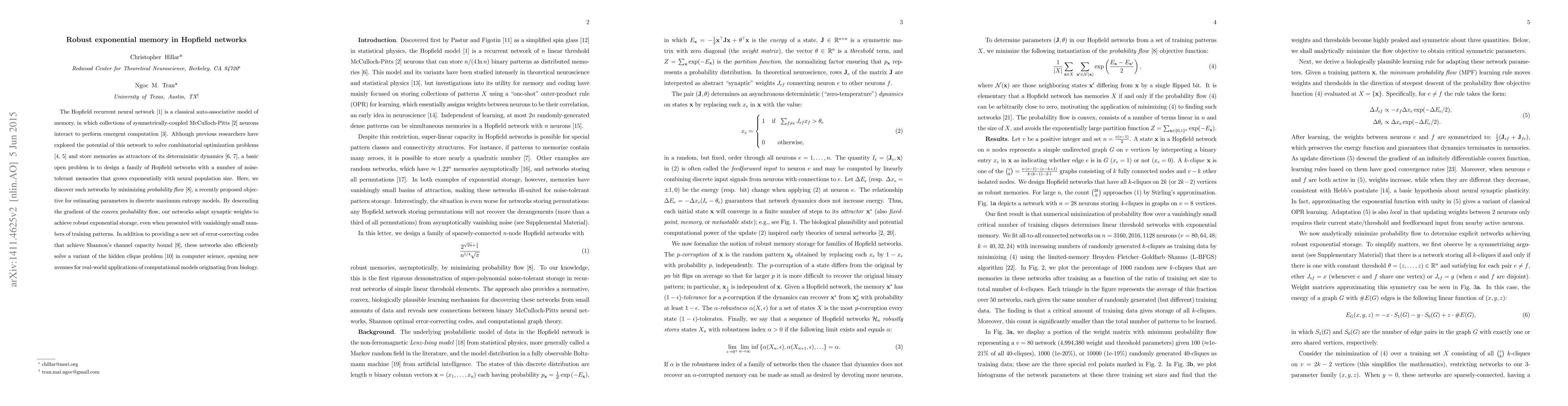 The Hopfield recurrent neural network is a classical auto-associative model of memory, in which collections of symmetrically-coupled McCulloch-Pitts neurons interact to perform emergent computation. Although previous researchers have explored the potential of this network to solve combinatorial optimization problems and store memories as attractors of its deterministic dynamics, a basic open problem is to design a family of Hopfield networks with a number of noise-tolerant memories that grows exponentially with neural population size. Here, we discover such networks by minimizing probability flow, a recently proposed objective for estimating parameters in discrete maximum entropy models. By descending the gradient of the convex probability flow, our networks adapt synaptic weights to achieve robust exponential storage, even when presented with vanishingly small numbers of training patterns. In addition to providing a new set of error-correcting codes that achieve Shannon's channel capacity bound, these networks also efficiently solve a variant of the hidden clique problem in computer science, opening new avenues for real-world applications of computational models originating from biology.