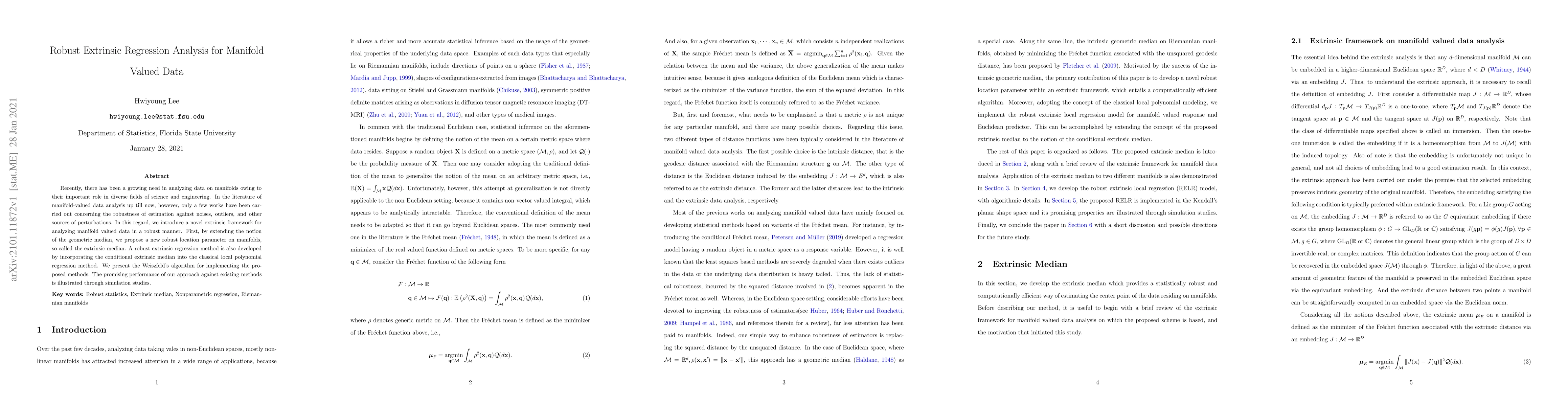 This paper introduces a novel extrinsic framework for robustly analyzing manifold-valued data by proposing an extrinsic median and a robust extrinsic regression method. The approach utilizes the Weiszfeld's algorithm and demonstrates superior performance over existing methods through simulation studies.