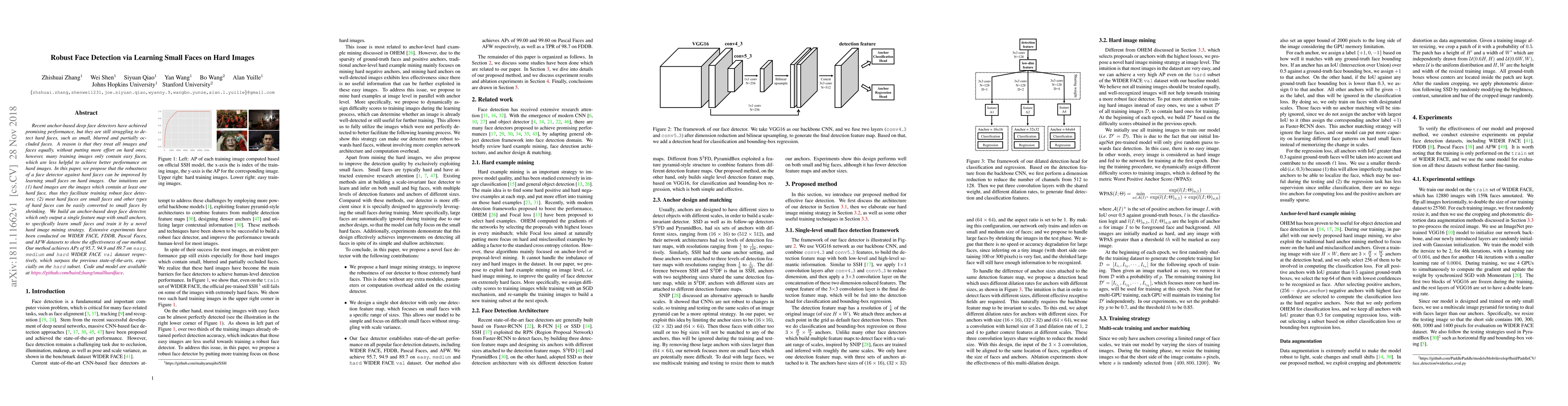 The paper proposes a novel face detection method that focuses on learning small faces on hard images. It builds an anchor-based deep face detector with a single feature map designed for small faces, trained using a novel hard image mining strategy.