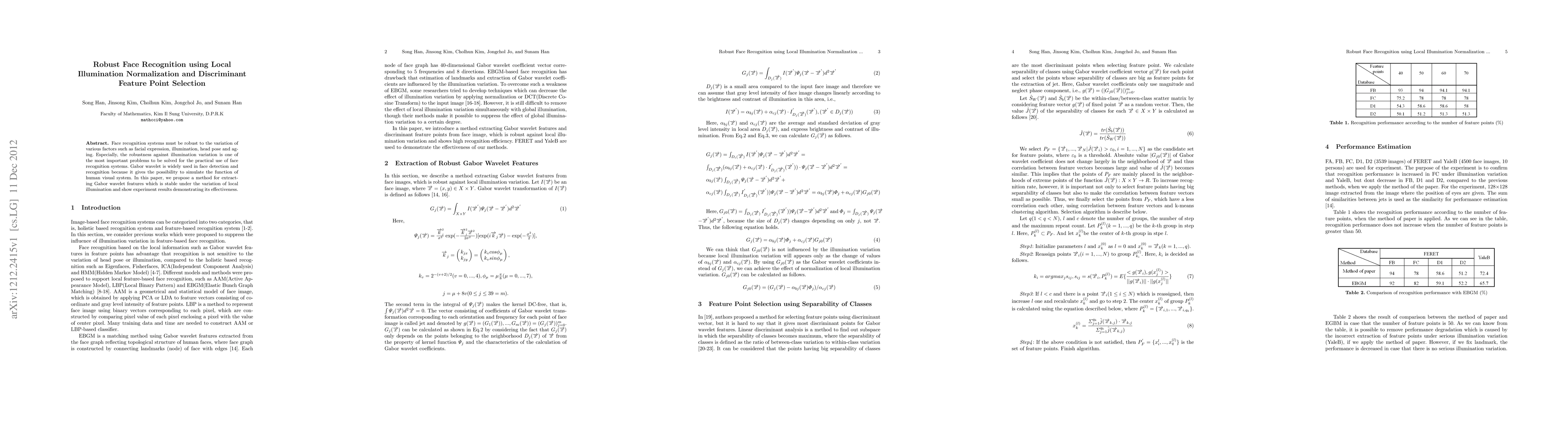 This paper proposes a method for robust face recognition using local illumination normalization and discriminant feature point selection. The method employs Gabor wavelet features that remain stable under local illumination variations, demonstrating improved effectiveness in face recognition experiments.