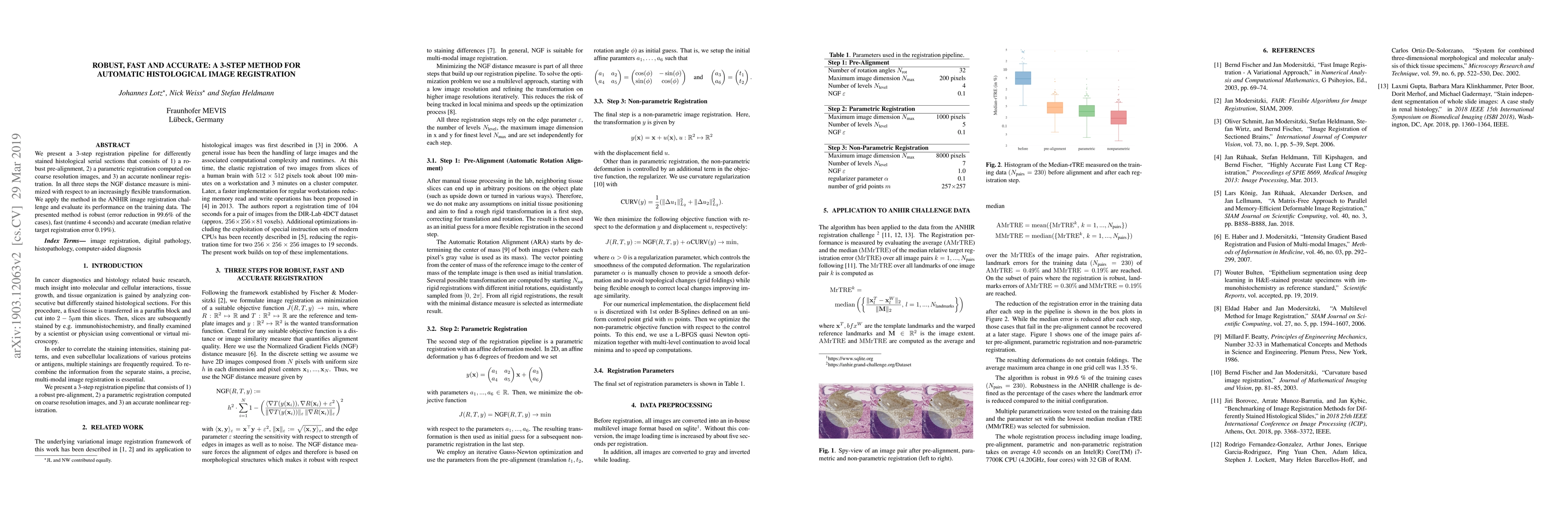 We present a 3-step registration pipeline for differently stained histological serial sections that consists of 1) a robust pre-alignment, 2) a parametric registration computed on coarse resolution images, and 3) an accurate nonlinear registration. In all three steps the NGF distance measure is minimized with respect to an increasingly flexible transformation. We apply the method in the ANHIR image registration challenge and evaluate its performance on the training data. The presented method is robust (error reduction in 99.6% of the cases), fast (runtime 4 seconds) and accurate (median relative target registration error 0.19%).