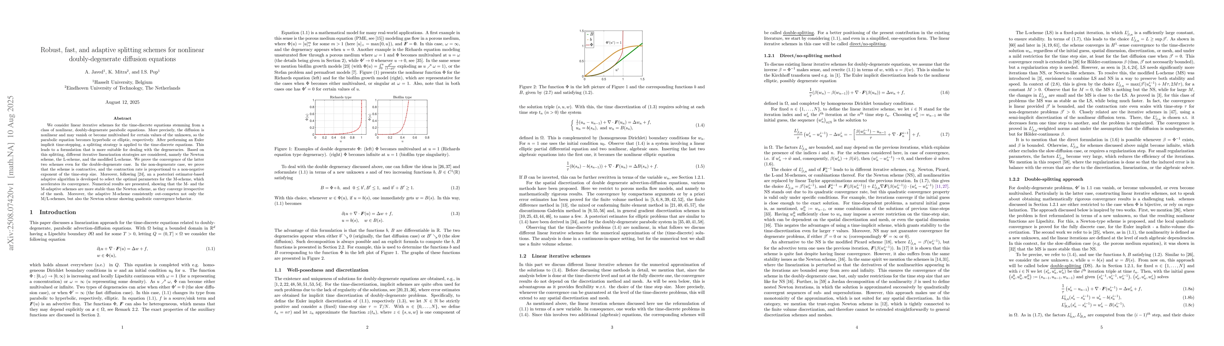 The paper introduces novel linear iterative schemes with a splitting strategy and adaptive parameter selection for nonlinear doubly-degenerate diffusion equations, providing convergence proofs and numerical validation.