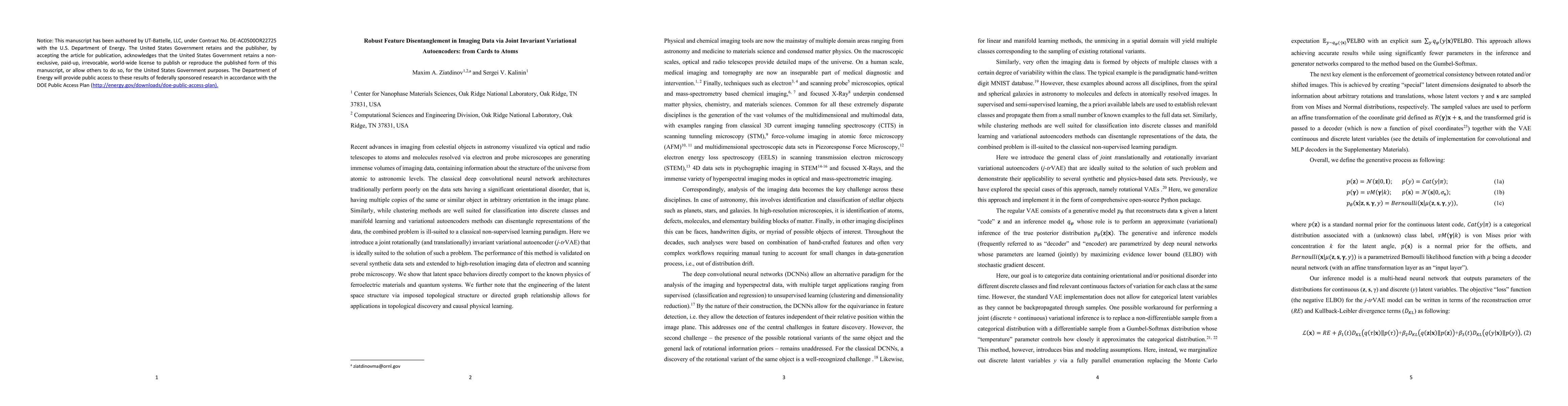 Recent advances in imaging from celestial objects in astronomy visualized via optical and radio telescopes to atoms and molecules resolved via electron and probe microscopes are generating immense volumes of imaging data, containing information about the structure of the universe from atomic to astronomic levels. The classical deep convolutional neural network architectures traditionally perform poorly on the data sets having a significant orientational disorder, that is, having multiple copies of the same or similar object in arbitrary orientation in the image plane. Similarly, while clustering methods are well suited for classification into discrete classes and manifold learning and variational autoencoders methods can disentangle representations of the data, the combined problem is ill-suited to a classical non-supervised learning paradigm. Here we introduce a joint rotationally (and translationally) invariant variational autoencoder (j-trVAE) that is ideally suited to the solution of such a problem. The performance of this method is validated on several synthetic data sets and extended to high-resolution imaging data of electron and scanning probe microscopy. We show that latent space behaviors directly comport to the known physics of ferroelectric materials and quantum systems. We further note that the engineering of the latent space structure via imposed topological structure or directed graph relationship allows for applications in topological discovery and causal physical learning.